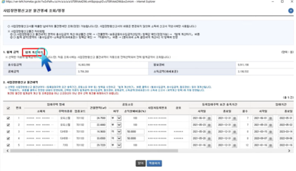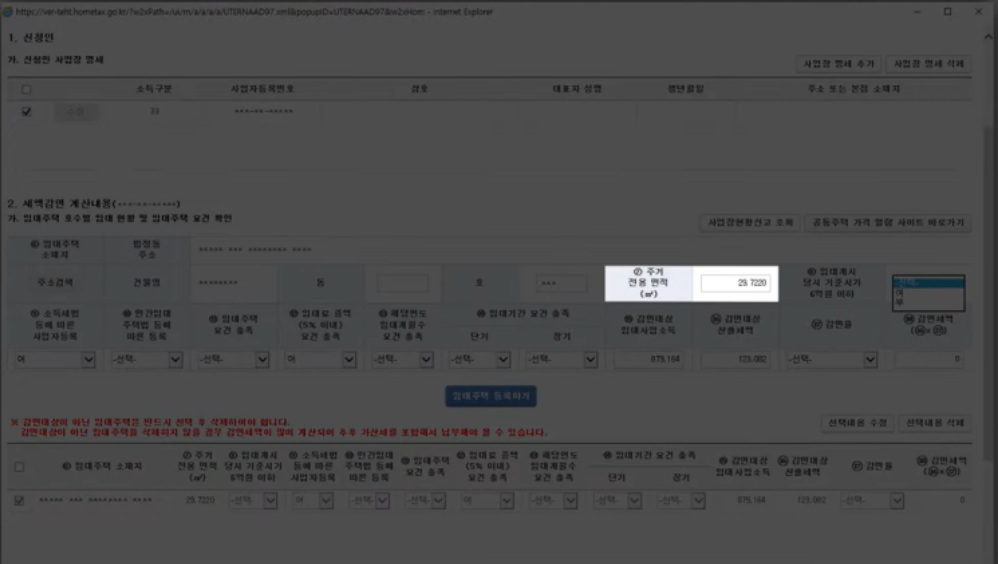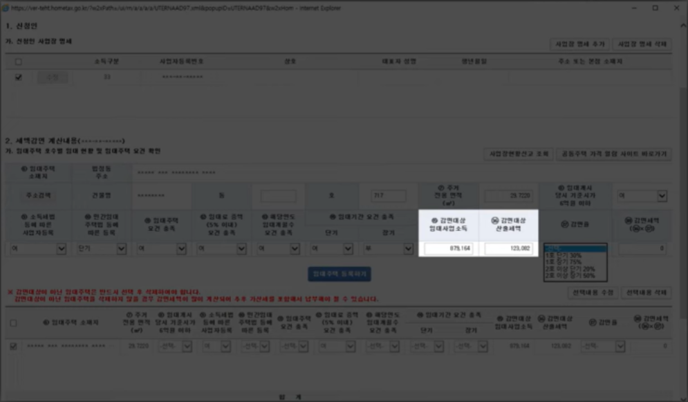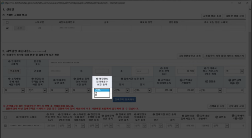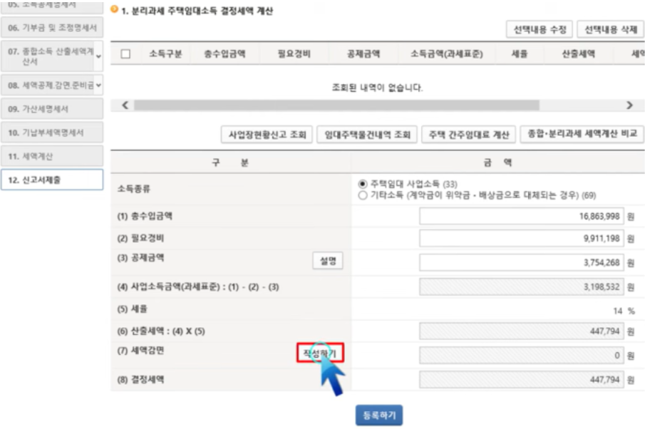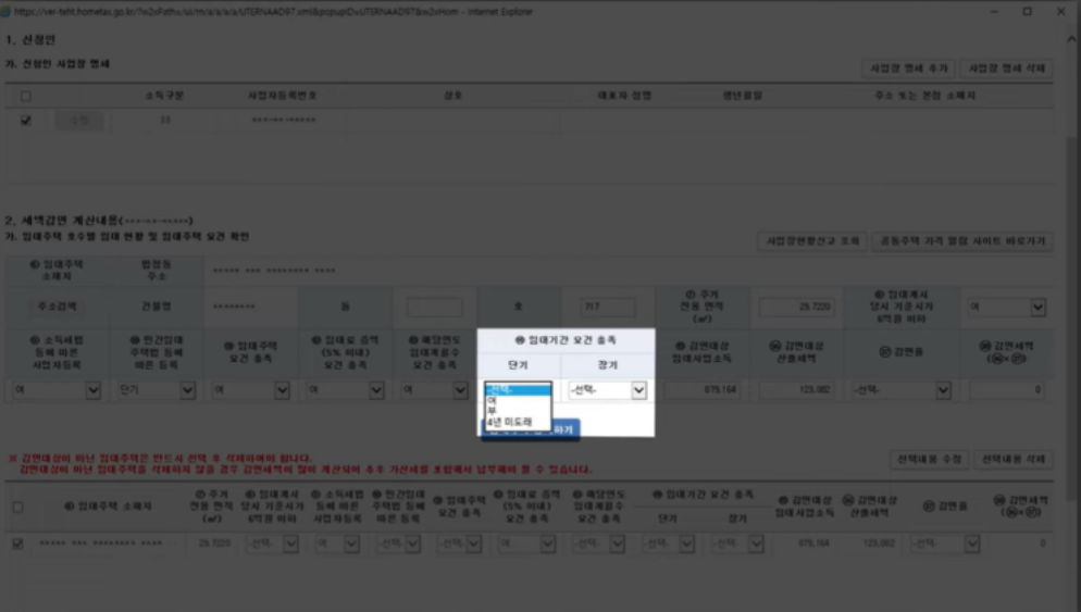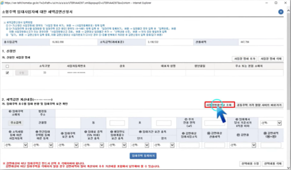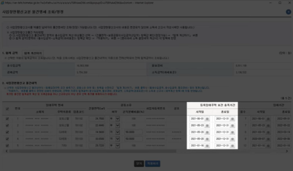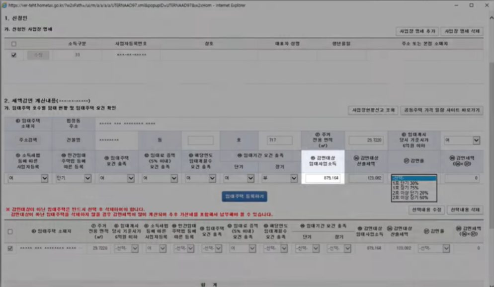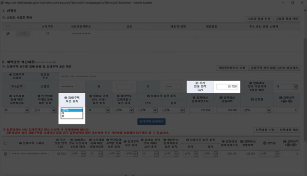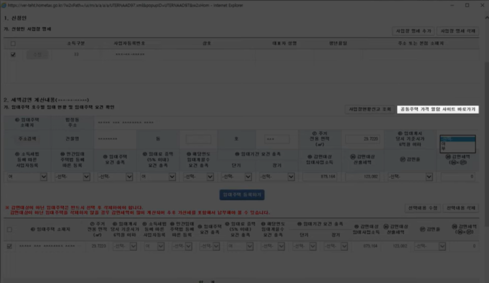 6. 화면 하단에 감면신청 대상 임대주택이 반영된 것 확인하기