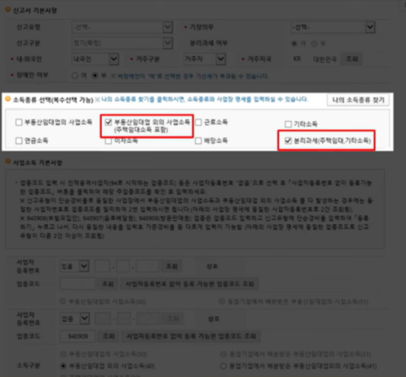5. 소득종류에 부동산임대업외의 사업소득과 분리과세 선택