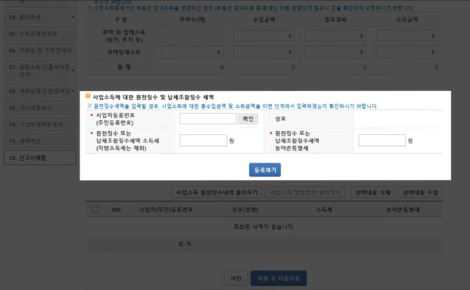 11. 사업소득에 대한 원천징수세액이 있는 경우 「사업소득에 대한 원천징수 및 납세조합징수 세액」을 입력 후 「등록하기」를 클릭하기