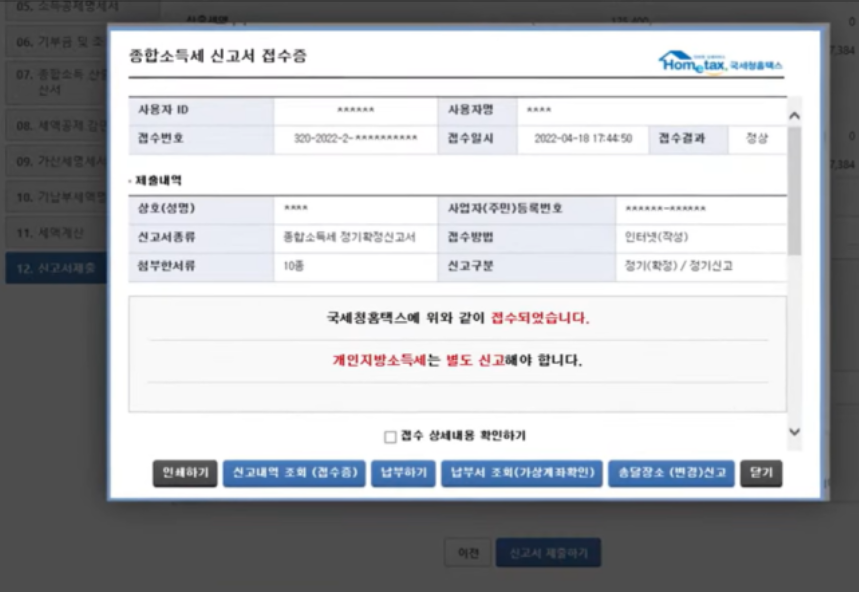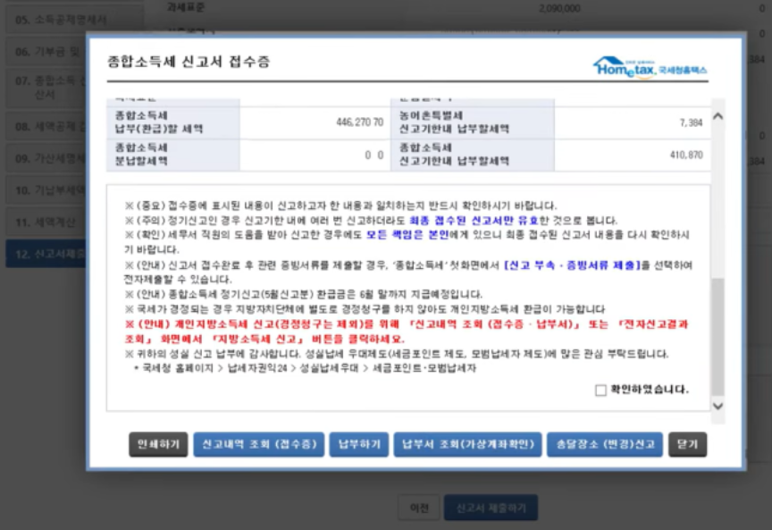 「종합소득세 신고서 접수증」이 나타납니다. 「젒수상세내용 확인하기」를 체크합니다.