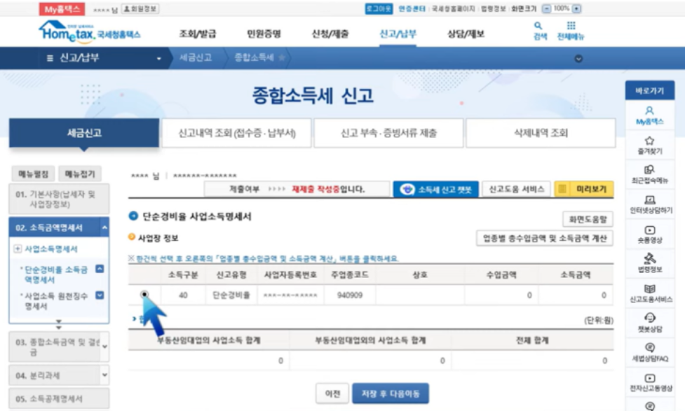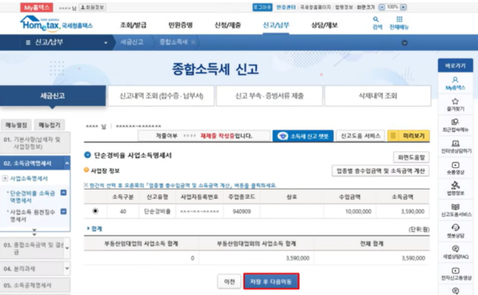 다시 「사업소득명세서」 화면으로 돌아왔습니다. 입력 내용이 정상적으로 반영된 것을 확인하신 후 하단의 「저장 후 다음이동」을 클릭합니다.