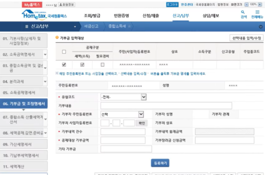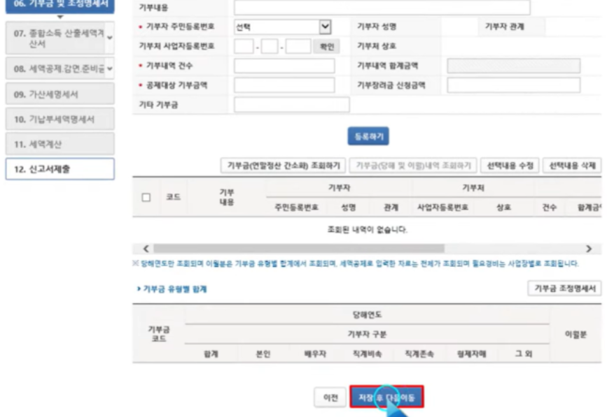 「기부금 명세서」 화면으로 이번 사례는 해당사항 없는 것으로 가정하겠습니다. 하단의 「저장 후 다음이동」을 클릭하겠습니다.