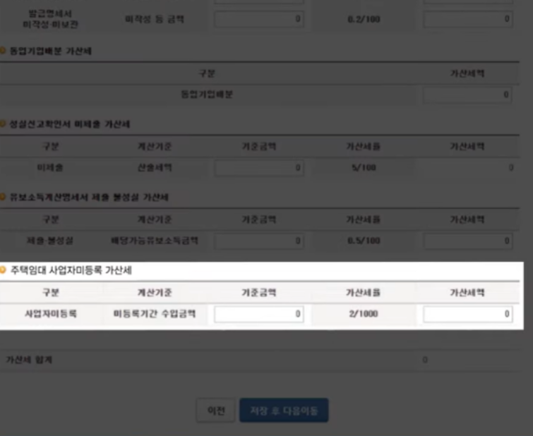 가산세 대상인 경우 「미등록기간 수입금액」을 입력하면 가산세는 자동 계산됩니다. 이번 사례는 해당사항 없음으로 「저장 후 다음이동」을 클릭합니다.