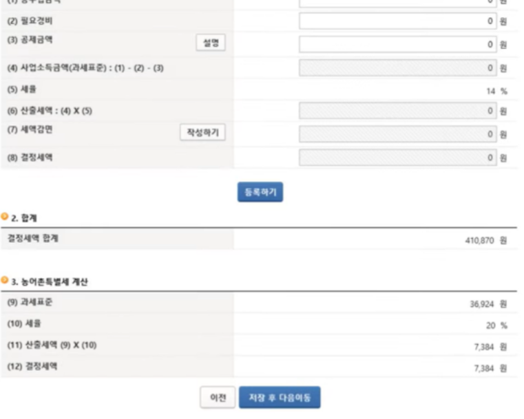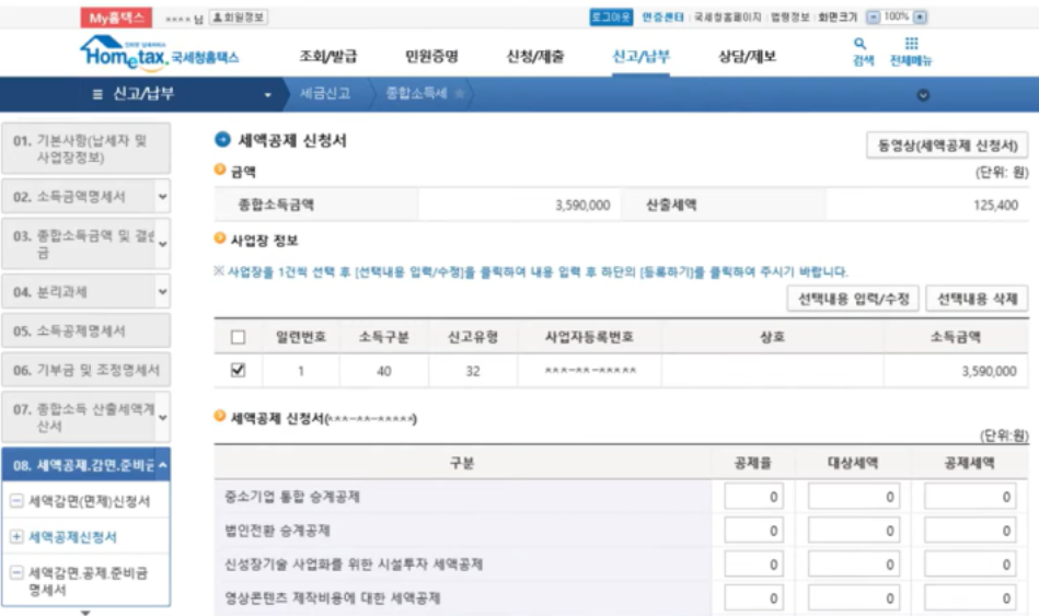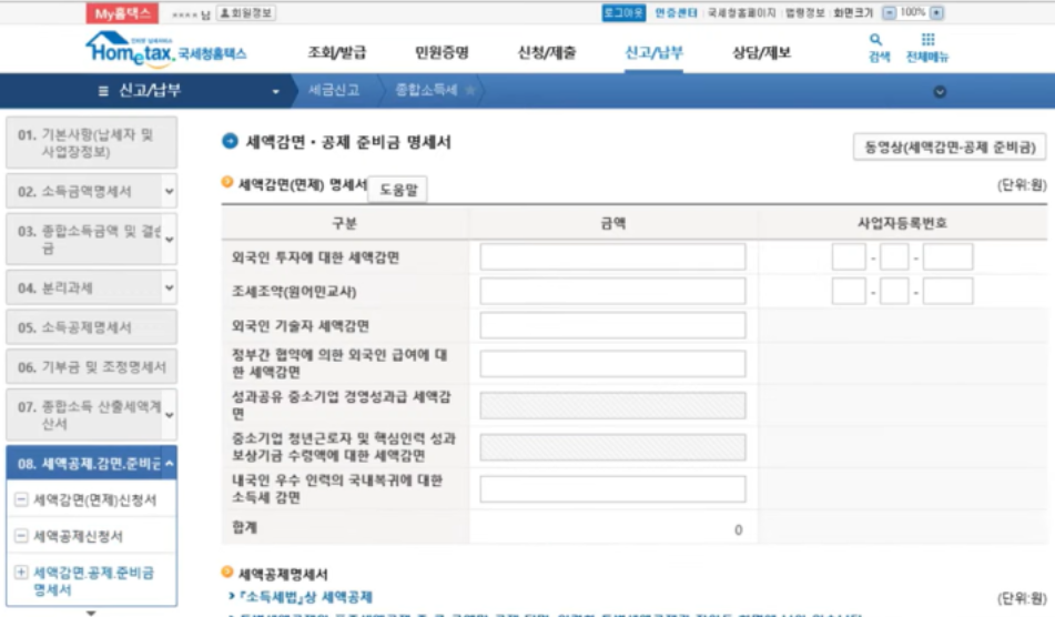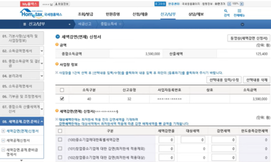 작성하기를 클릭하면 세액감면신청서 입력화면이 나타납니다.