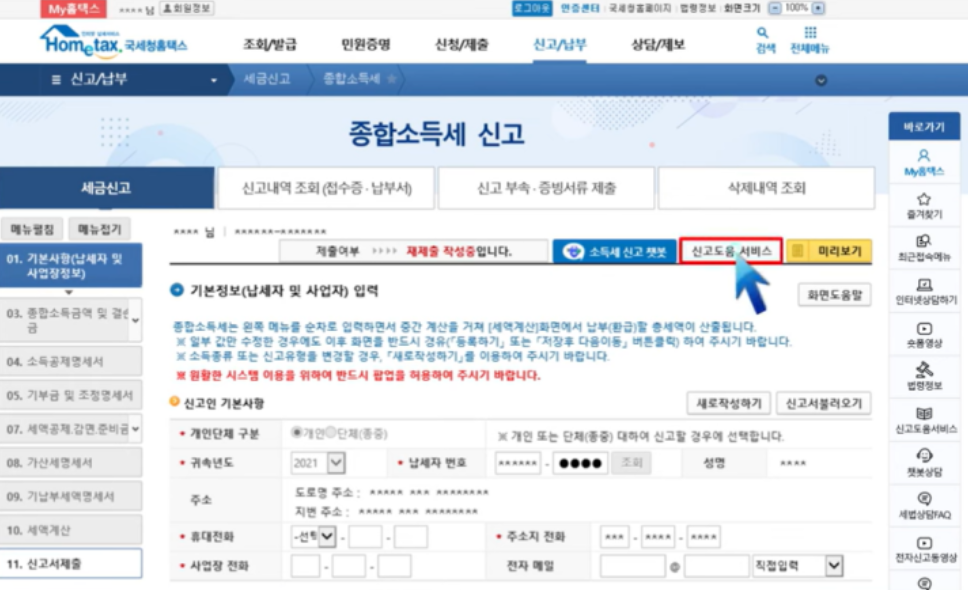3. 우측 상단의 「신고도움 서비스」를 클릭하여 세무서·지자체 임대사업자 등록 현황 등 종합소득세 신고에 필요 자료 조회