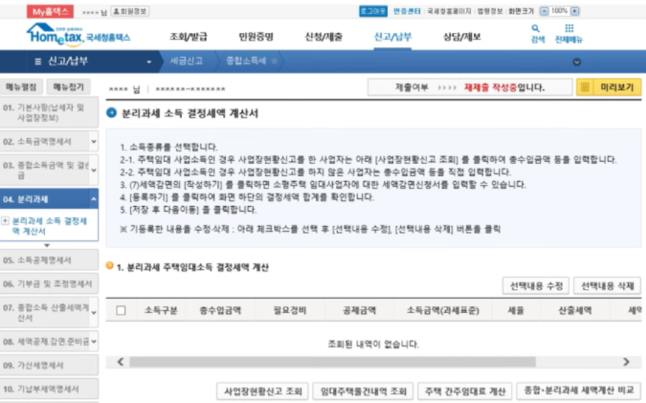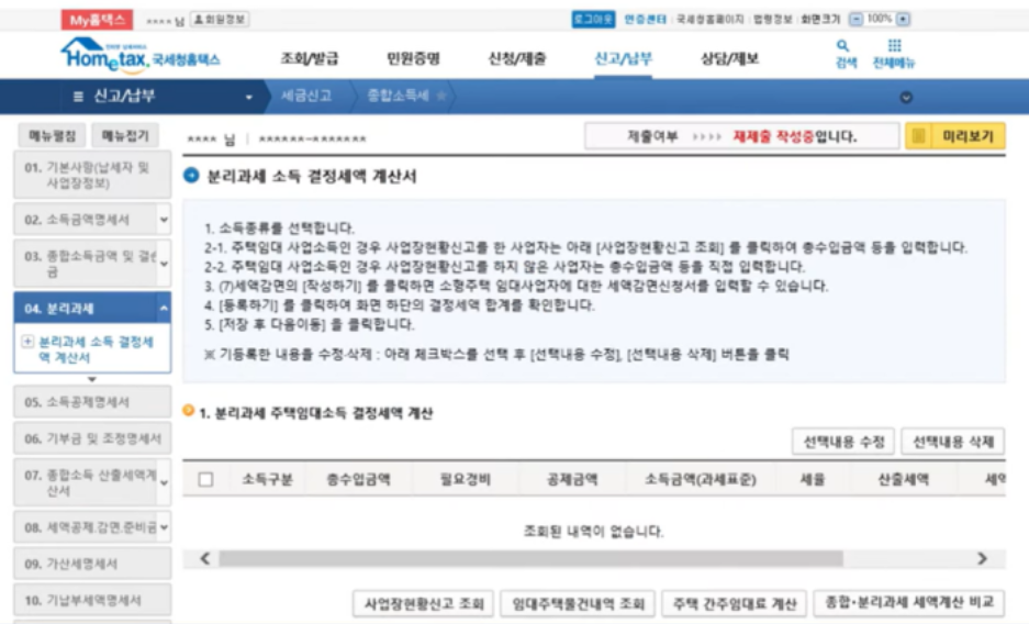 「분리과세 소득 결정세액 계산서」 화면으로 다시 돌아왔습니다.