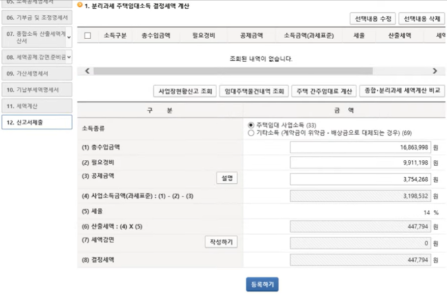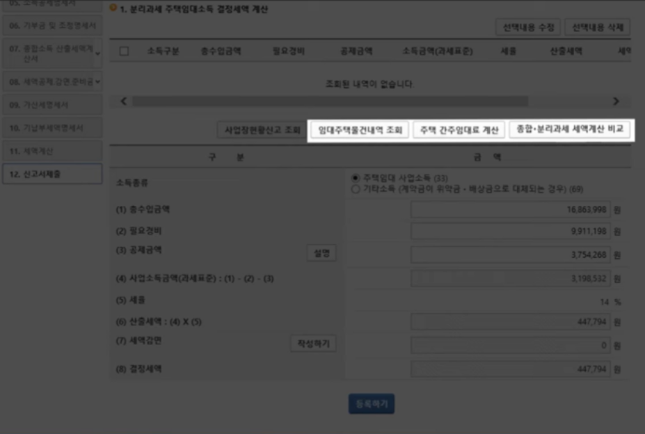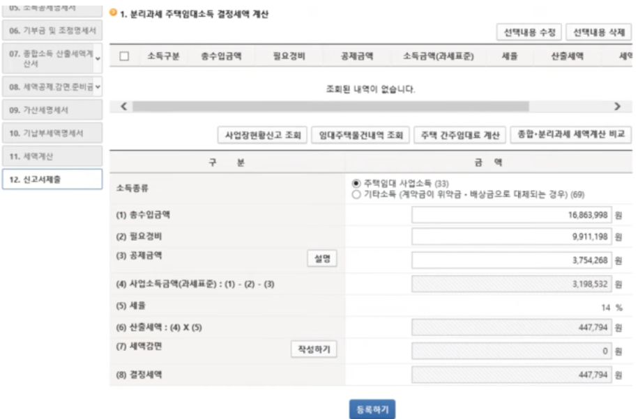 사업현황신고를 하지 않은 경우에는 「직접 계산하기」, 「임대주택물건내역 조회」, 「주택 간주임대료 계산」, 「종합·분리과세 세액계산 비교」를 이용하여 총수입금액, 필요경비, 공제금액을 직접 계산 후 입력하면 됩니다.
