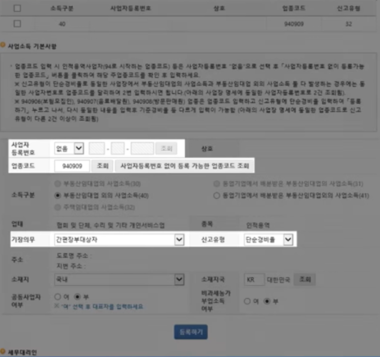6. 「사업자등록번호」는 없음. 「업종코드」는 940909, 「기장의무」는 간편장부대상자, 「신고유형」은 단순경비율을 각각 선택 후 하단의 「등록하기」를 클릭하기