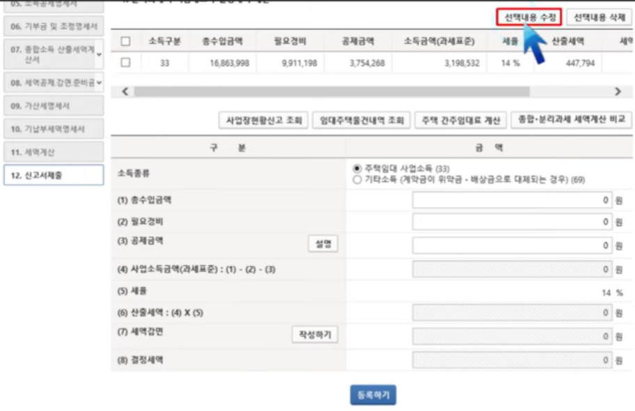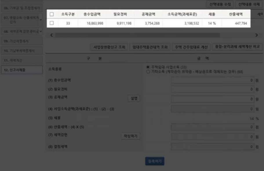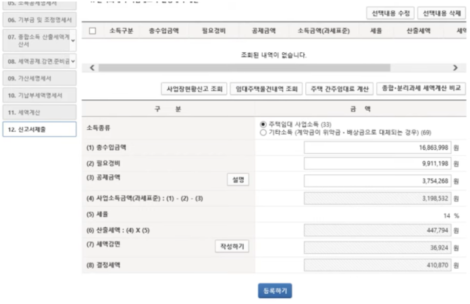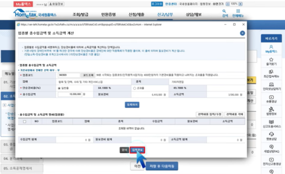 8. 「등록하기」를 클리가면 「총수입금액 및 소득금액 및 소득금액 명세」에 입력 내용이 반영되며 모두 입력하였으면 「입력완료」 클릭