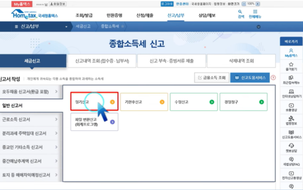 2. 종합소득세 신고화면으로 이동하여 일반신고의 「정기신고」 클릭하기