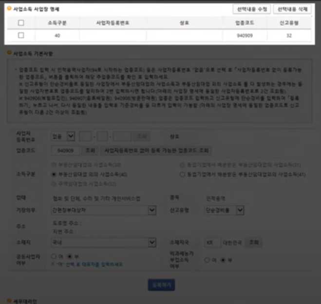 6. 「사업자등록번호」는 없음. 「업종코드」는 940909, 「기장의무」는 간편장부대상자, 「신고유형」은 단순경비율을 각각 선택 후 하단의 「등록하기」를 클릭하기
