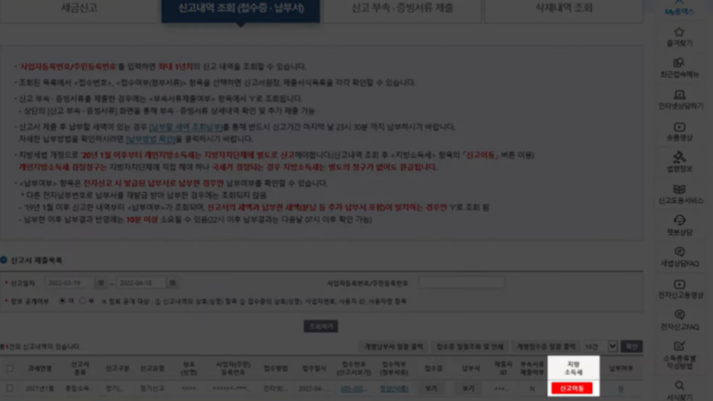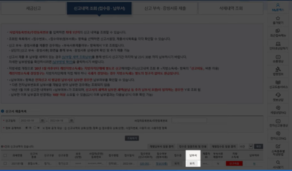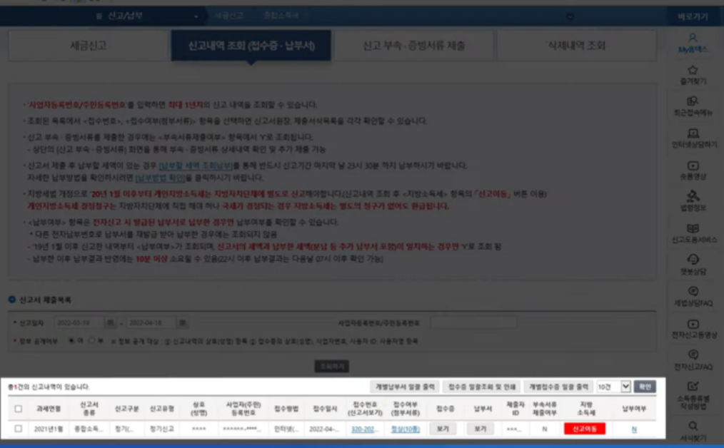 「조회하기」를 클릭하면 하단에 종합소득세 신고내역이 나타납니다.