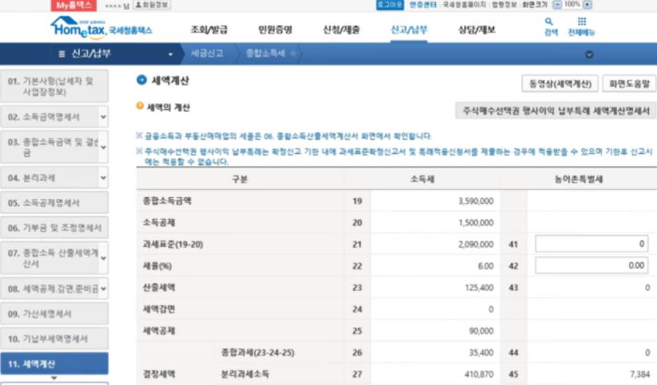 「세액계산」 환면입니다. 종합과세 대상인 인적용역 소득과 분리과세 주택임대 소득에 대한 결정세액이 각각 구분되어서 표시되며 감면세액에 대한 농어촌특별세액도 반영된 것을 확인할 수 있습니다.