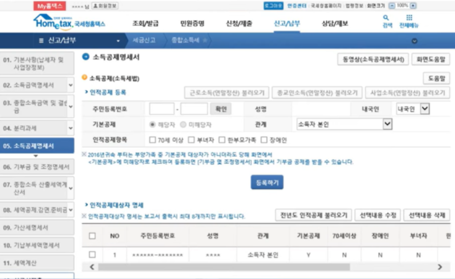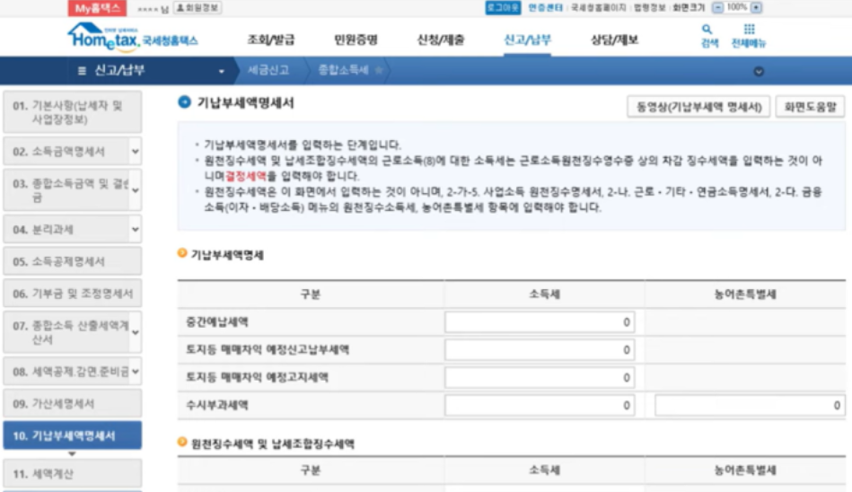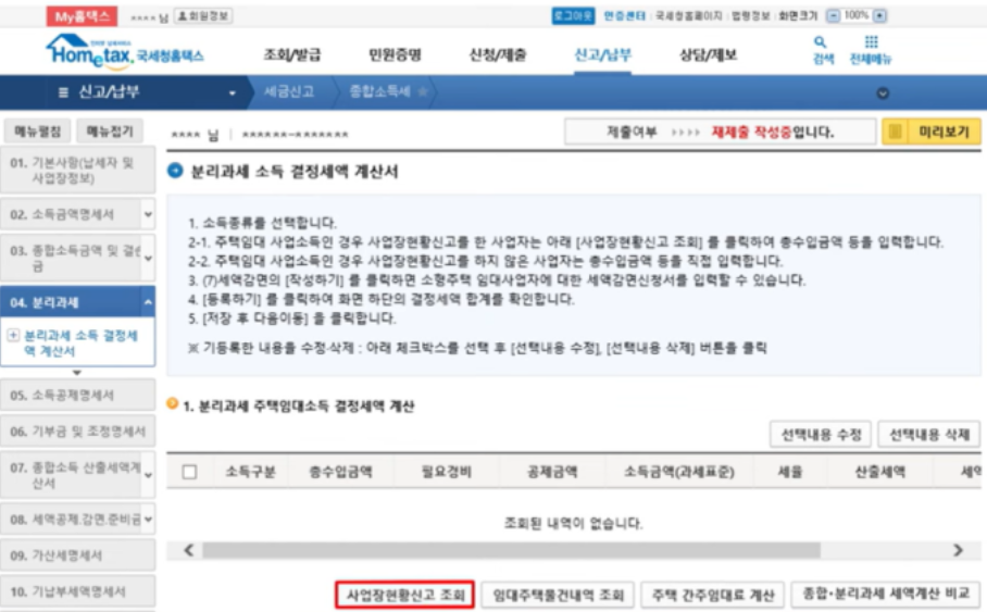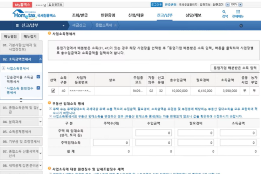 10. 「사업소득명세서 및 원천징수세액」 화면가기
