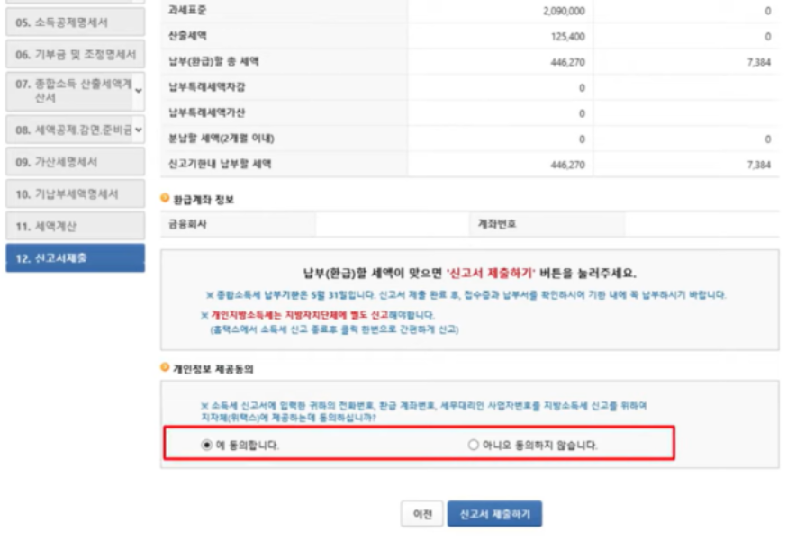 「신고서제출」 화면입니다. 신고서를 제출하기 전 신고내용을 최종적으로 확인하는 단계이며 이상이 없으면 「개인정보 제공동의」 여부를 선택 후 「신고서 제출하기」를 클릭합니다. 종합소득세 신고와는 별도로 개인지방소득세를 신고할 수 있습니다. 개인지방소득세 신고 절차는 마지막에 별도로 설명하겠습니다.