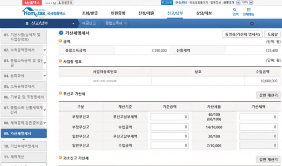 「가산세 명세서」화면입니다. 화면 하단으로 이동합니다.