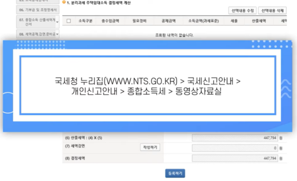 「주택 간주임대료 계산」과 「종합·분리과세 세액계산 비교」 이용 방법을 안내한 동영상은 국세청 누리집에 게시하였으니 참고하면 됩니다.