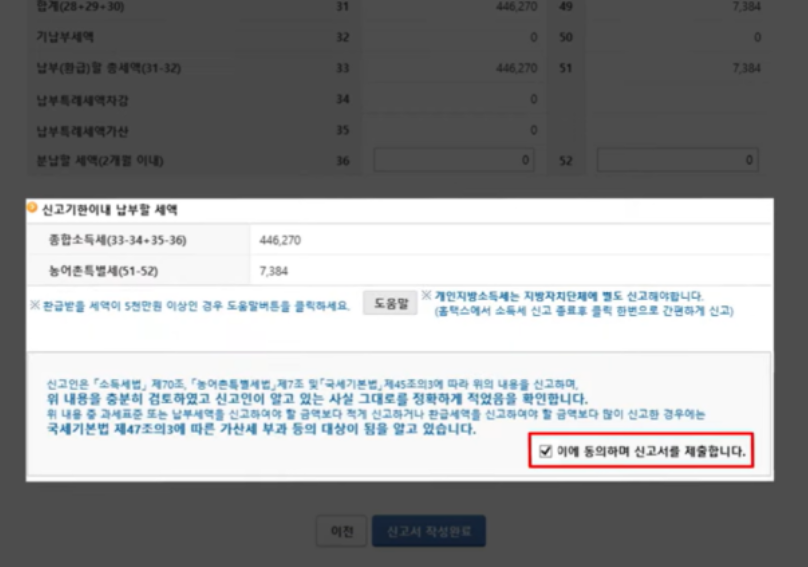 하단 화면으로 이동 후 「납부할 세액」 확인 및 「동의여부」에 체크 후 「신고서 작성완료」를 클릭합니다.