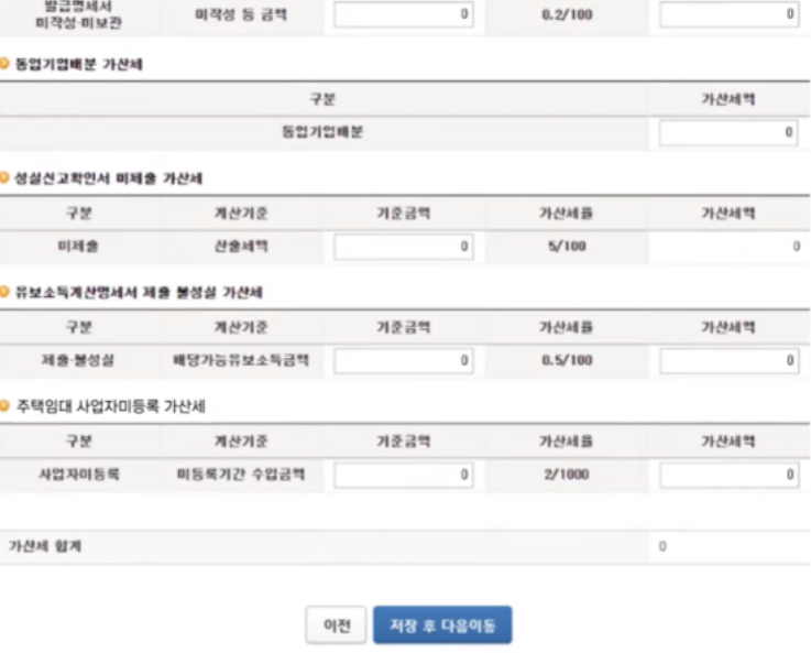 가산세 대상인 경우 「미등록기간 수입금액」을 입력하면 가산세는 자동 계산됩니다. 이번 사례는 해당사항 없음으로 「저장 후 다음이동」을 클릭합니다.