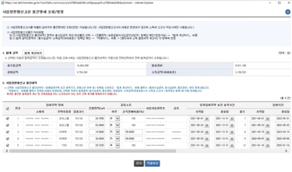 14. 「사업장현황신고분 물건명세」가 나타난다.