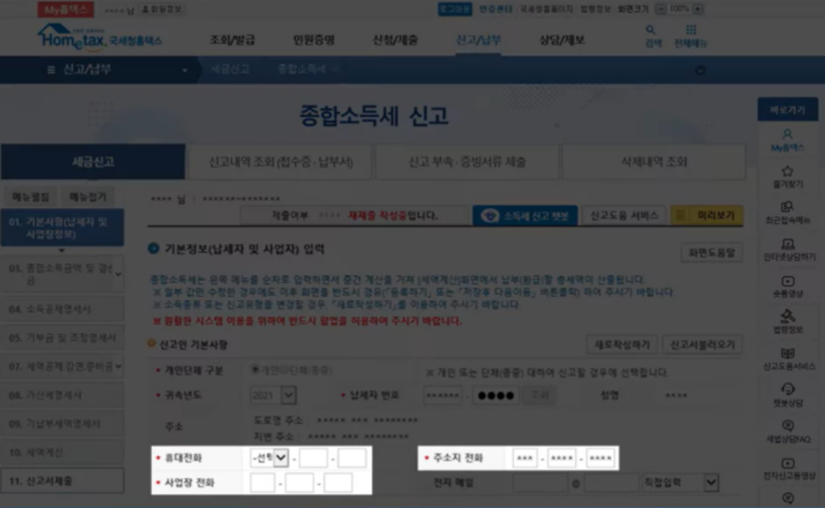 4. 주소지 전화와 사업장 전호, 휴대전하 중 하나는 반드시 입력