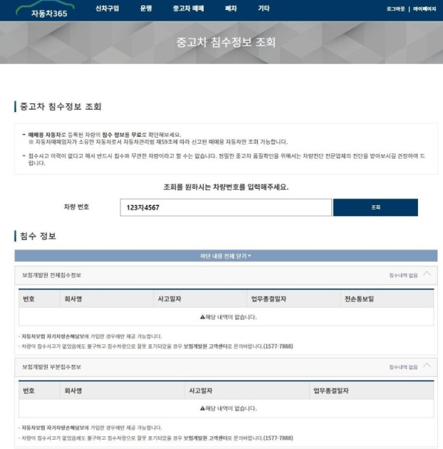 자동차365에서 침수차량 정보조회