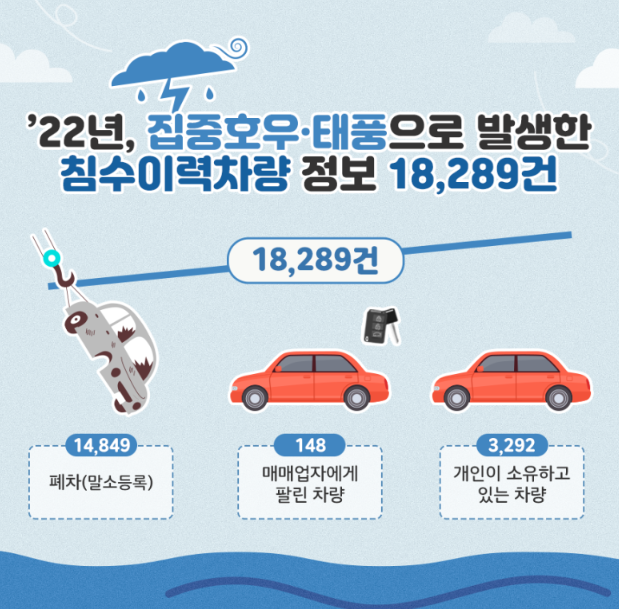 지난해 국토교통부에서는 8~9월 집중호우와 태풍으로 발생한 침수차량 중 침수 이력이 있는 차량 정보를 18,289건 확보했습니다. 이 중 14,849건은 폐차되었고, 148건은 매매업자에게 팔렸으며, 3,292건은 개인이 계속해서 소유하고 있는 것으로 확인되었다고 합니다.