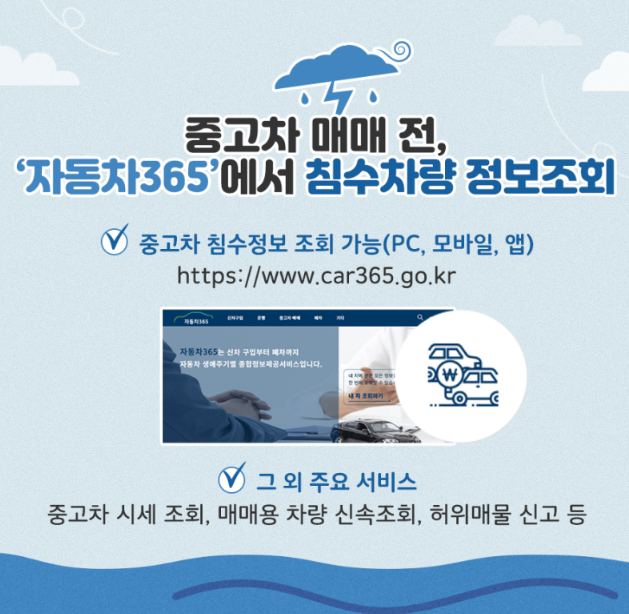 따라서, 중고차를 구입할 계획이 있는 소비자라면 자동차 종합정보 제공 서비스 '자동차365'에서 중고차 침수정보 조회 서비스를 꼭 이용해 보세요. PC, 모바일, 앱에서 이용할 수 있습니다.