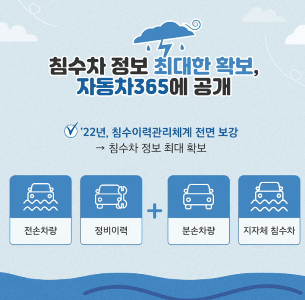 침수차 정보는 '자동차365'에 공개하여 중고차를 구입하고자 할 때 차량의 침수 여부를 손쉽게 알 수 있게 했습니다.