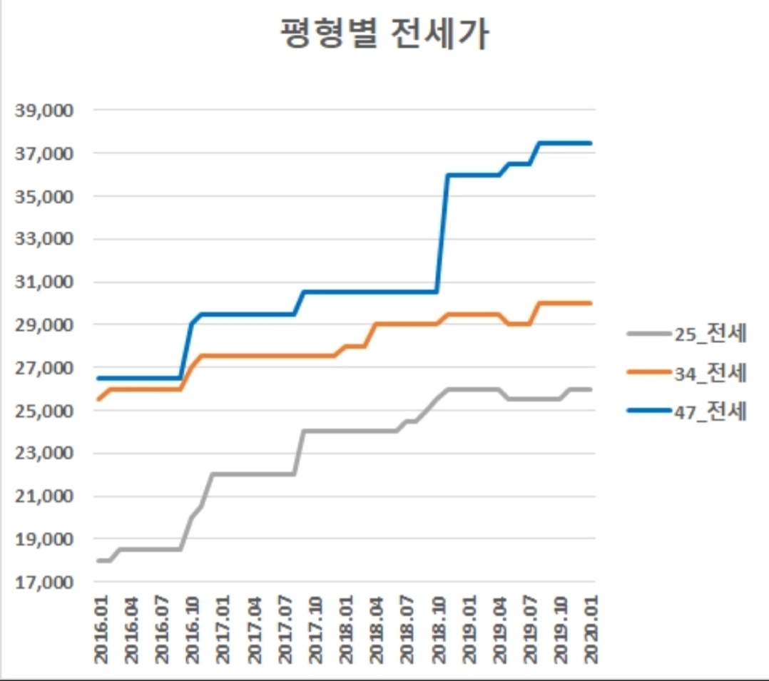 동일지역으로 예를 들면, 20평대 평당가 2천500백이고, 30평대가 2천 400백, 4~50평대가 1천8백대 수준이었습니다.