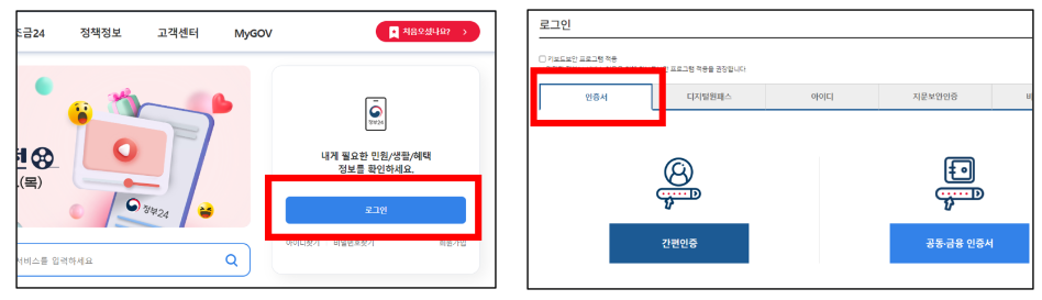 서비스를 이용하기 위해서는 우선 정부 24에 회원 가입을 한 후, '인증서'로 로그인해 줍니다.