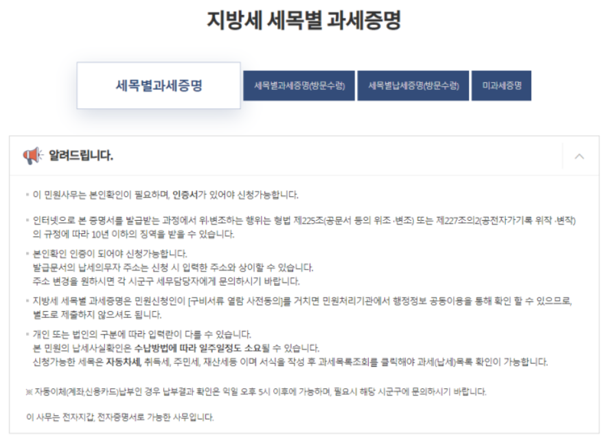 무료로 발급 받을 수 있도록 제공하는 서비스가 지방세 세목별 과세증명 서비스입니다.