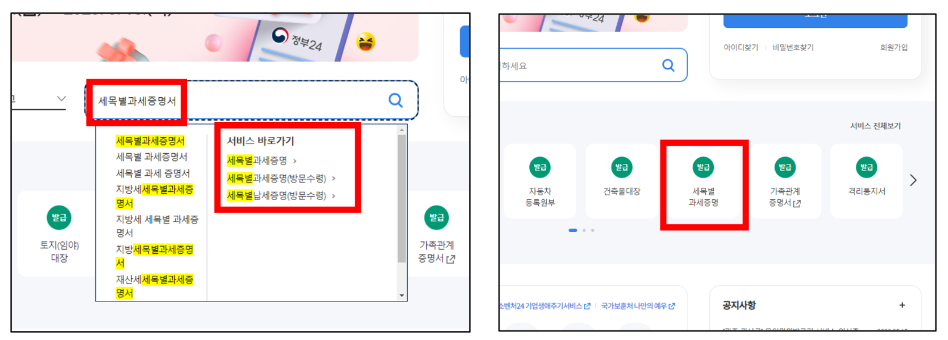 정부 24 홈페이지에서 검색창에 '세목별 과세증명서'를 키워드로 입력하여 찾거나, 메인 페이지가 자주 찾는 서비스에서 찾아 클릭하면 발급 안내 페이지로 연결됩니다.