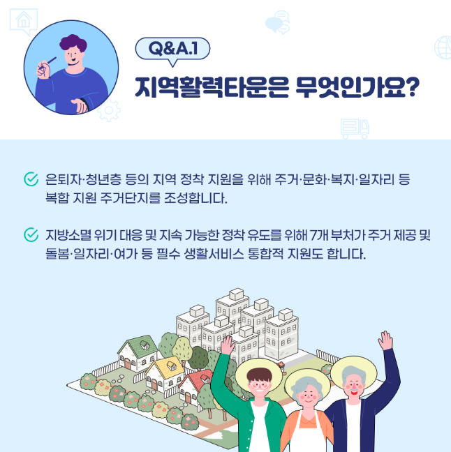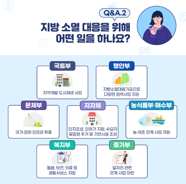 지방소멸 위기 대응 및 지속 가능한 정착 유도를 위해 7개 부처가 주거 제공 및 돌봄·일자리·여가 등 필수 생활서비스 통합적 지원도 합니다.