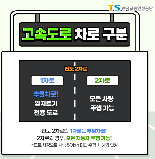 편도 2차로의 1차로는 추월차로이며, 2차로의 경우, 모든 자동차 주행 가능합니다.