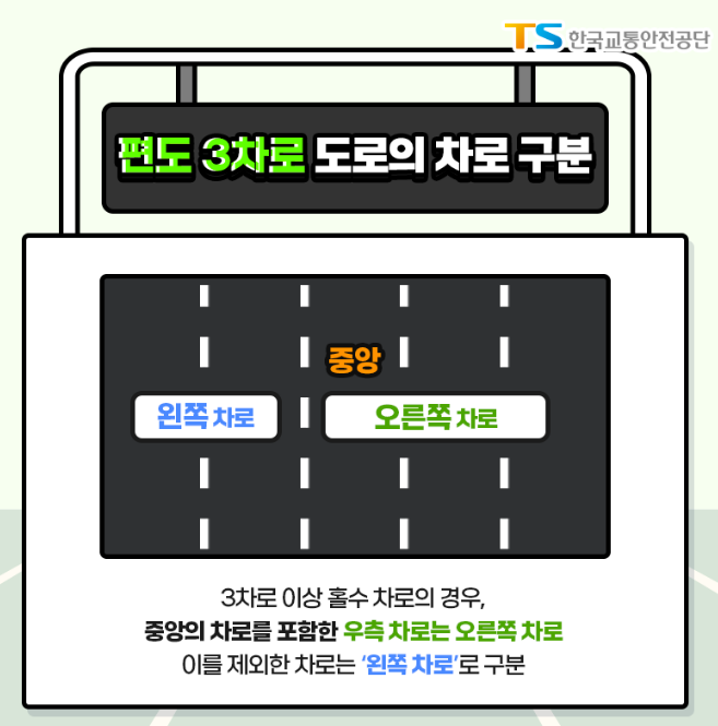 3차로 이상 홀수 차로의 경우, 중앙의 차로를 포함한 우측 차로는 오른쪽 차로로 하며, 이를 제외한 차로는 '왼쪽 차로'로 구분합니다.