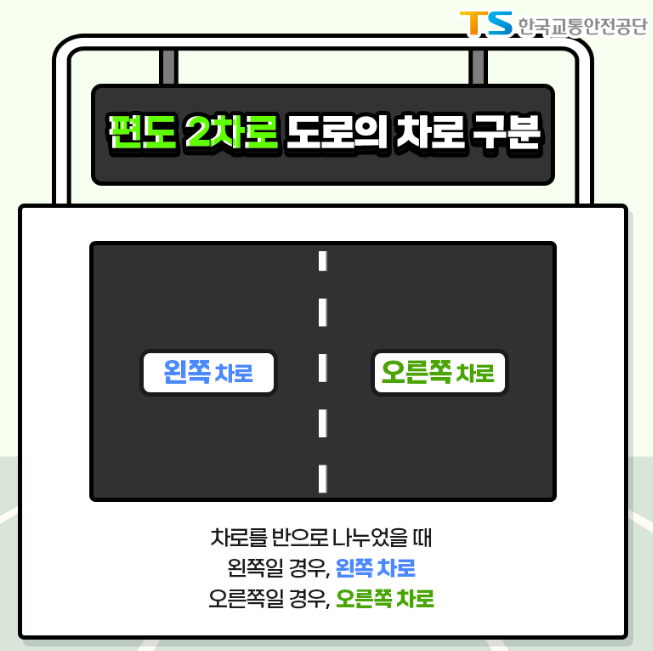 편도 2차로 도로의 차로 구분은 차로를 반으로 나누었을 때 왼쪽일 경우, 왼쪽 차로. 오른쪽일 경우, 오른쪽 차로가 됩니다.