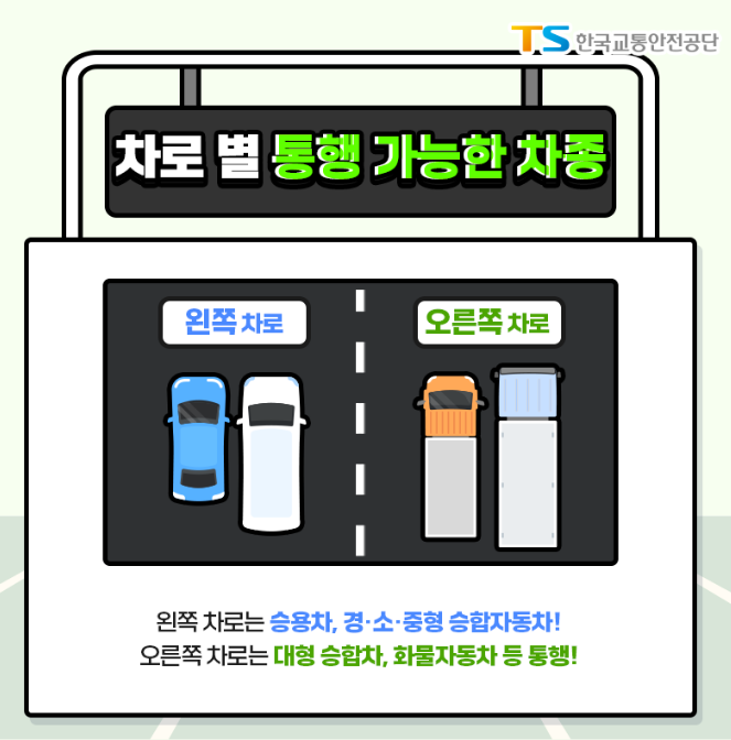 차로 별 통행 가능한 차종은 왼쪽 차로는 승용차, 경·소·중형 승합자동차 통행이 가능하며 오른쪽 차로는 대형 승합차, 화물자동차 등 통행이 가능하다고 합니다.