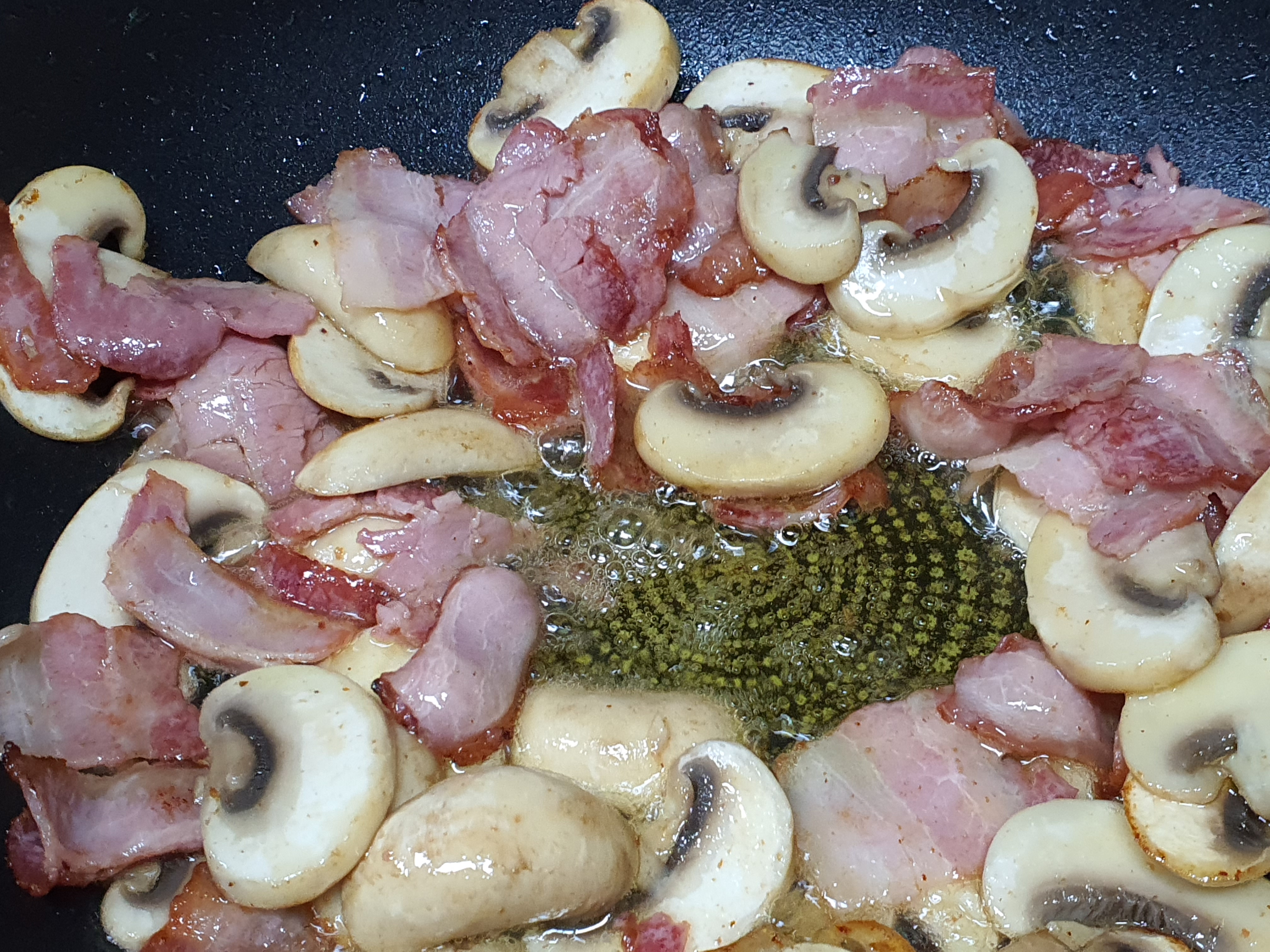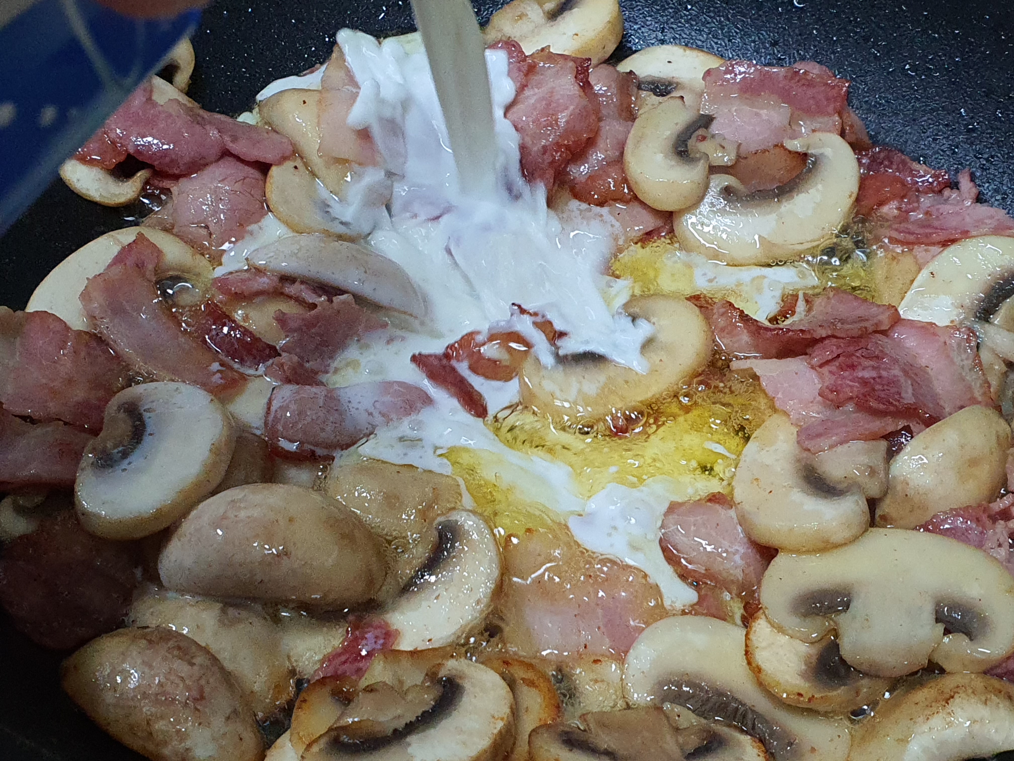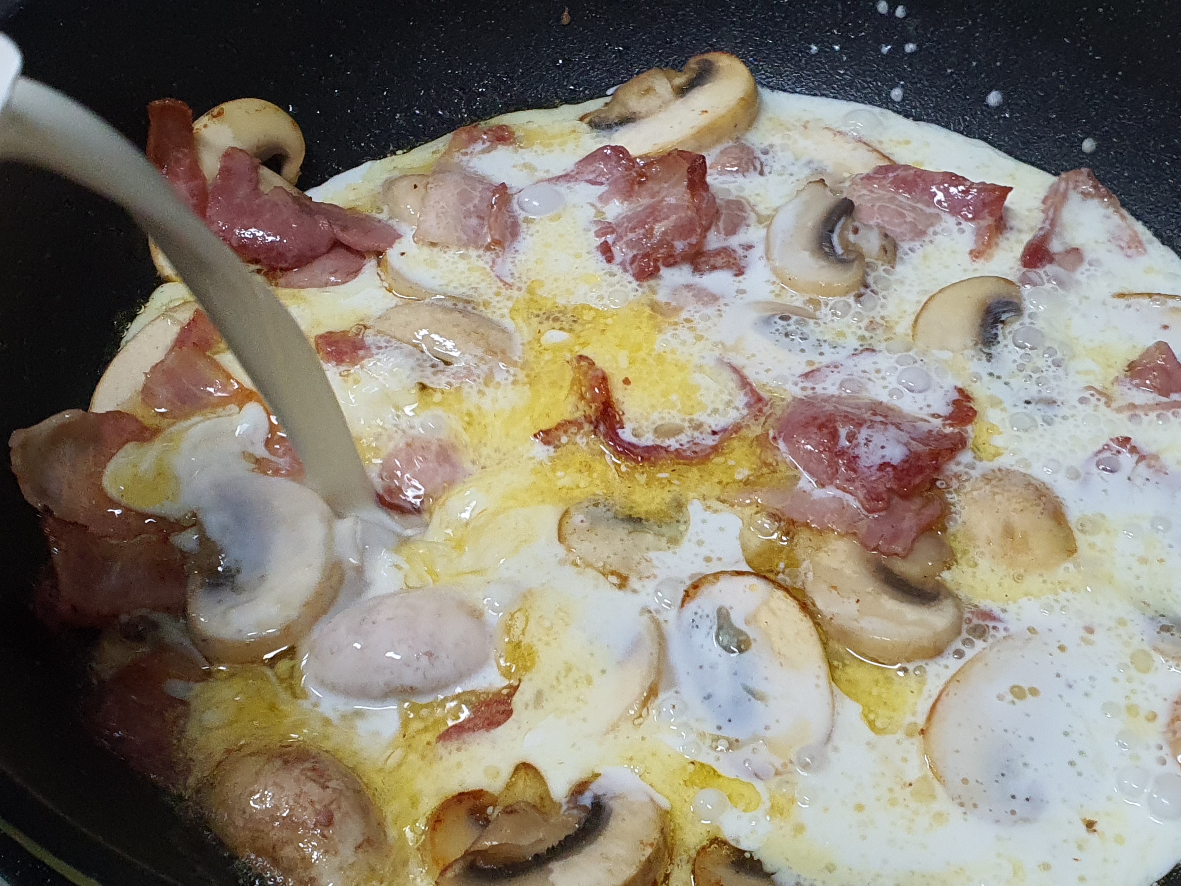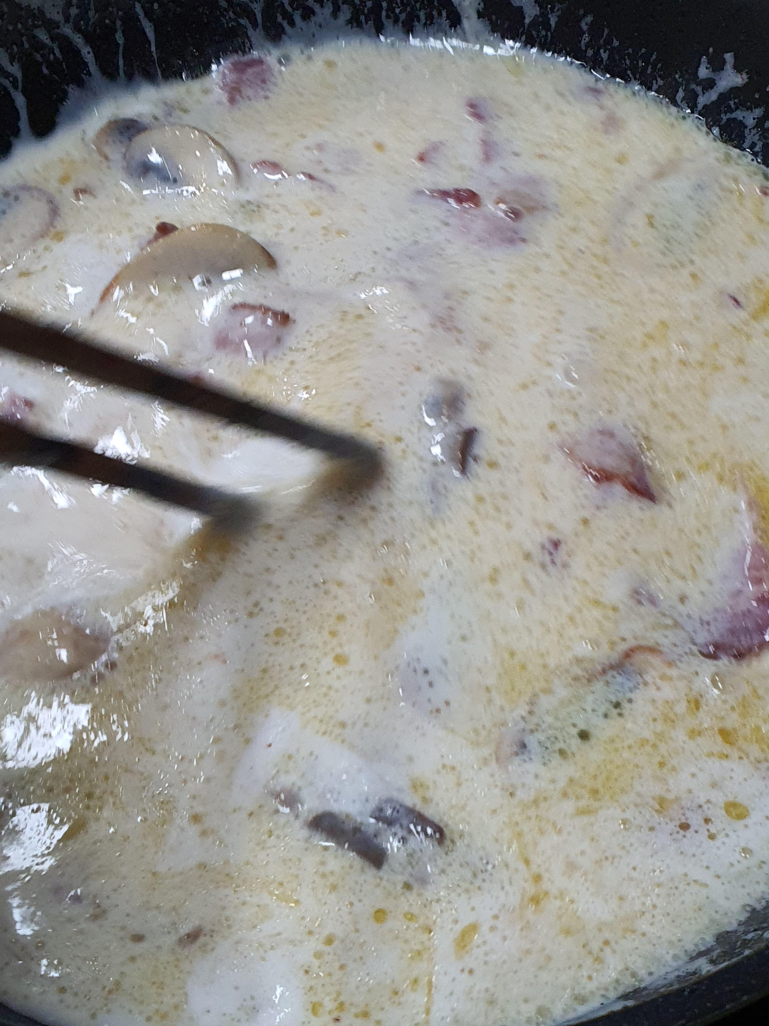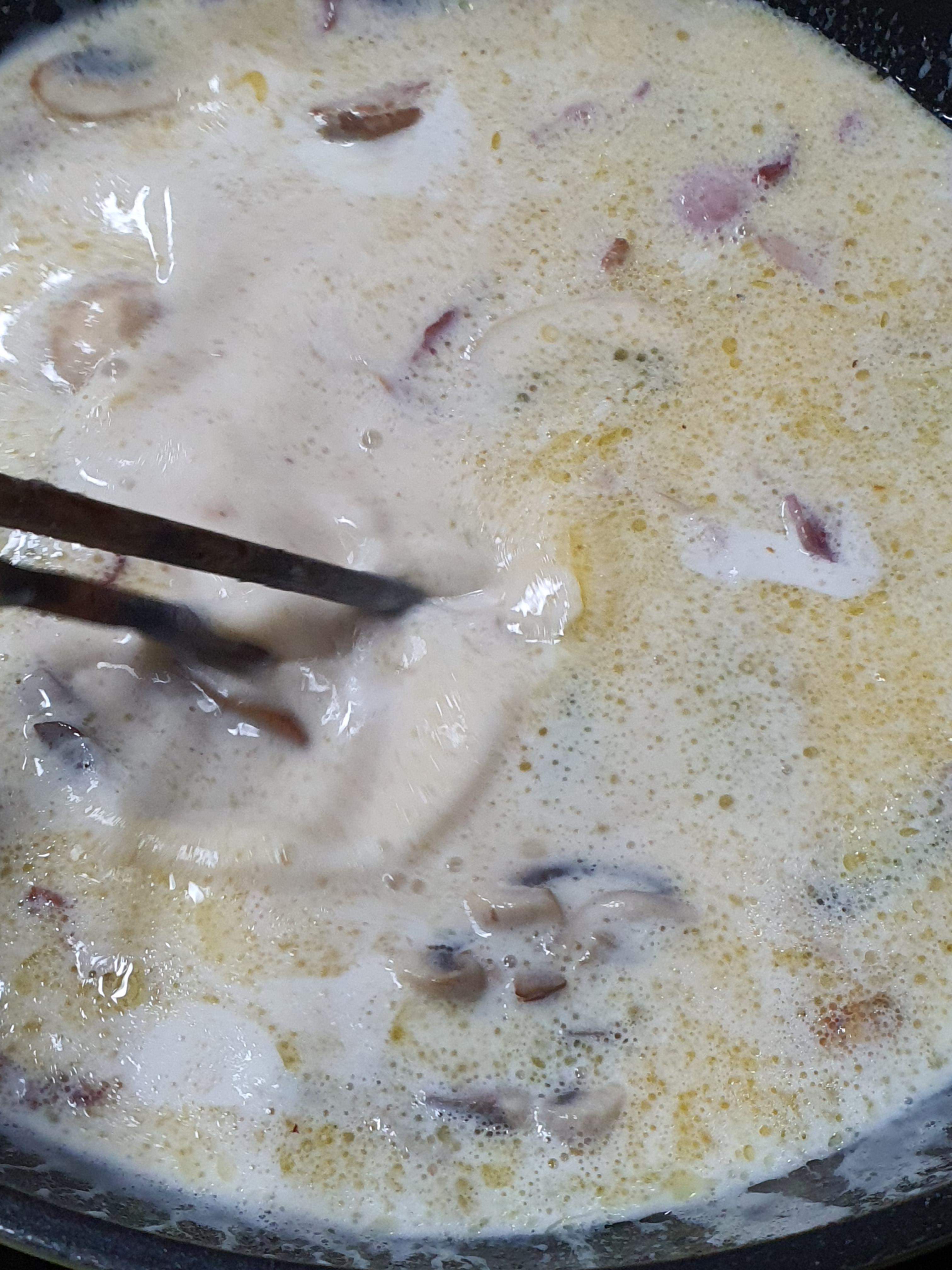 그리고, 버터에 양송이와 베이컨을 구워주고 우유 하나를 넣어줍니다.