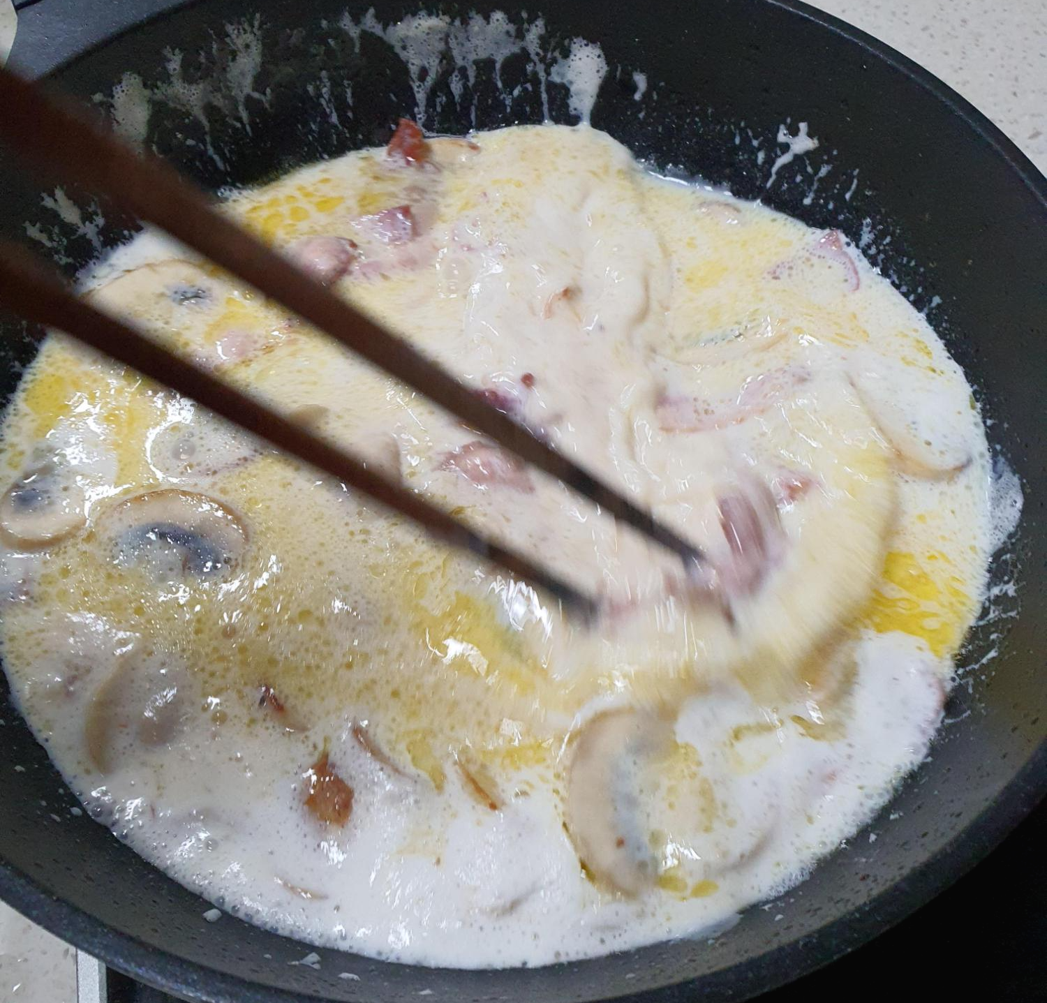 버터, 베이컨과 양송이버섯, 그리고 스파게티면과 우유, 까르보나라 파스타 소스 하나입니다.