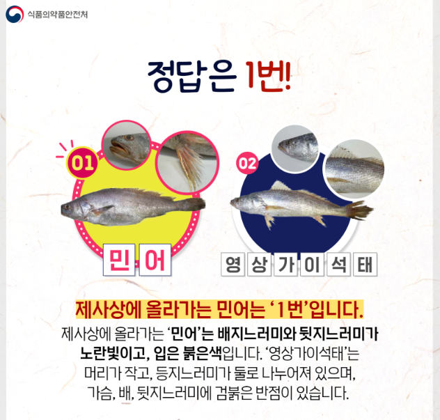 제사상에 올라가는 '민어'는 베지느러미와 뒷지느러미가 노란빛이고, 입은 붉은색입니다. '영상가이석태'는 머리가 작고, 등지느러미가 둘로 나누어져 있으며, 가슴, 배, 뒷지느러미에 검붉은 반점이 있습니다.