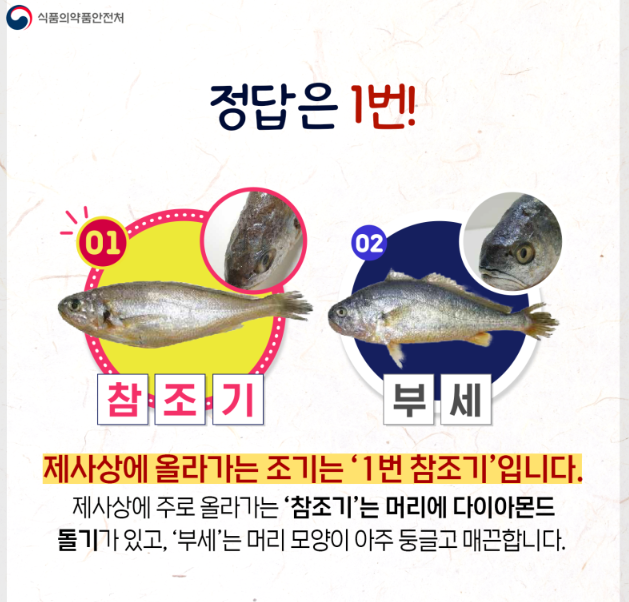 제사상에 올라가는 '참조기'는 머리에 다이아몬드 돌기가 있고, '부세'는 머리 모양이 아주 둥글고 매끈합니다.