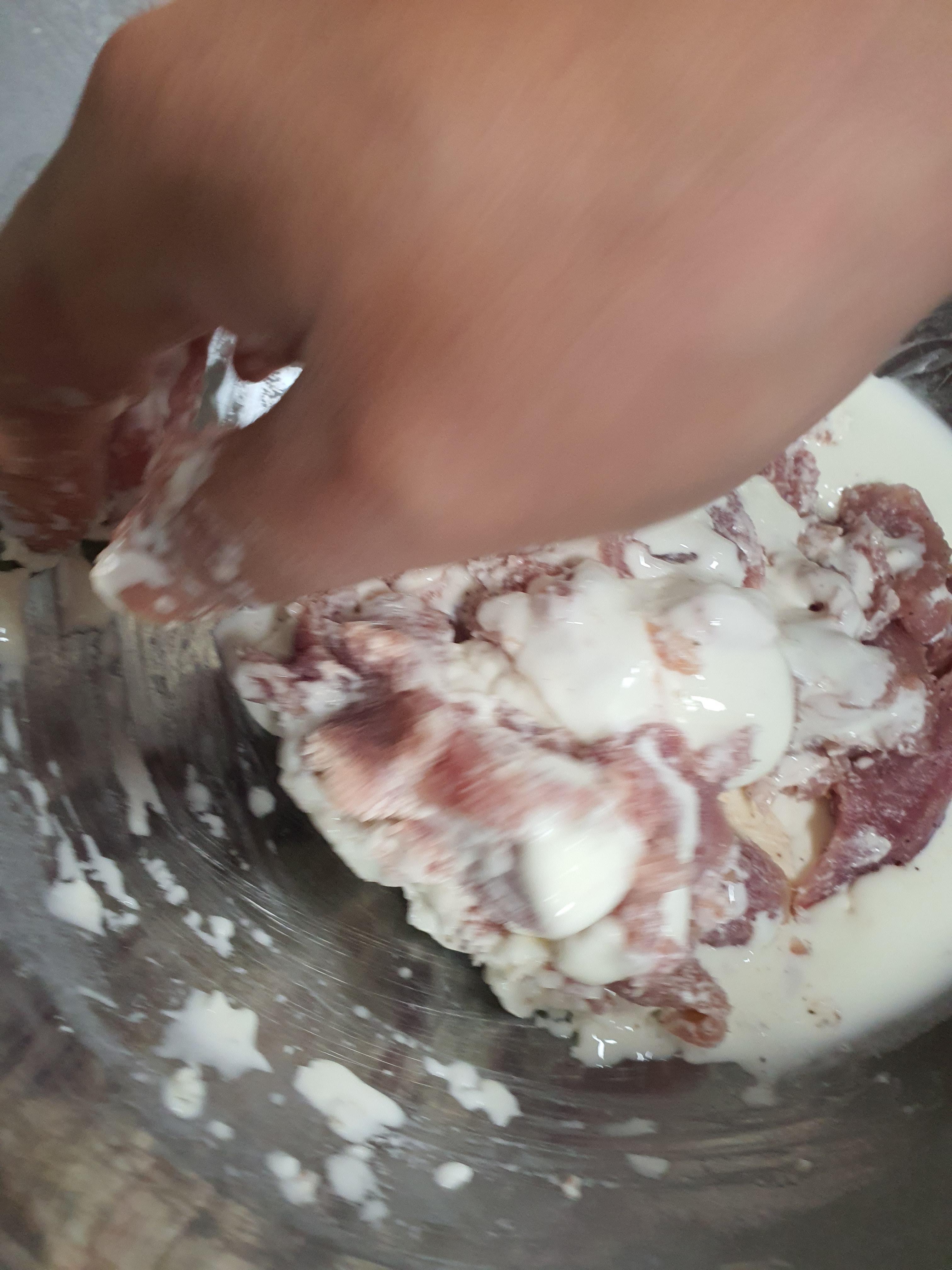 5. 전분가루의 윗물은 다른 그릇에 옮겨 놓고 고기를 넣어 전분가루액과 잘 섞어줍니다.