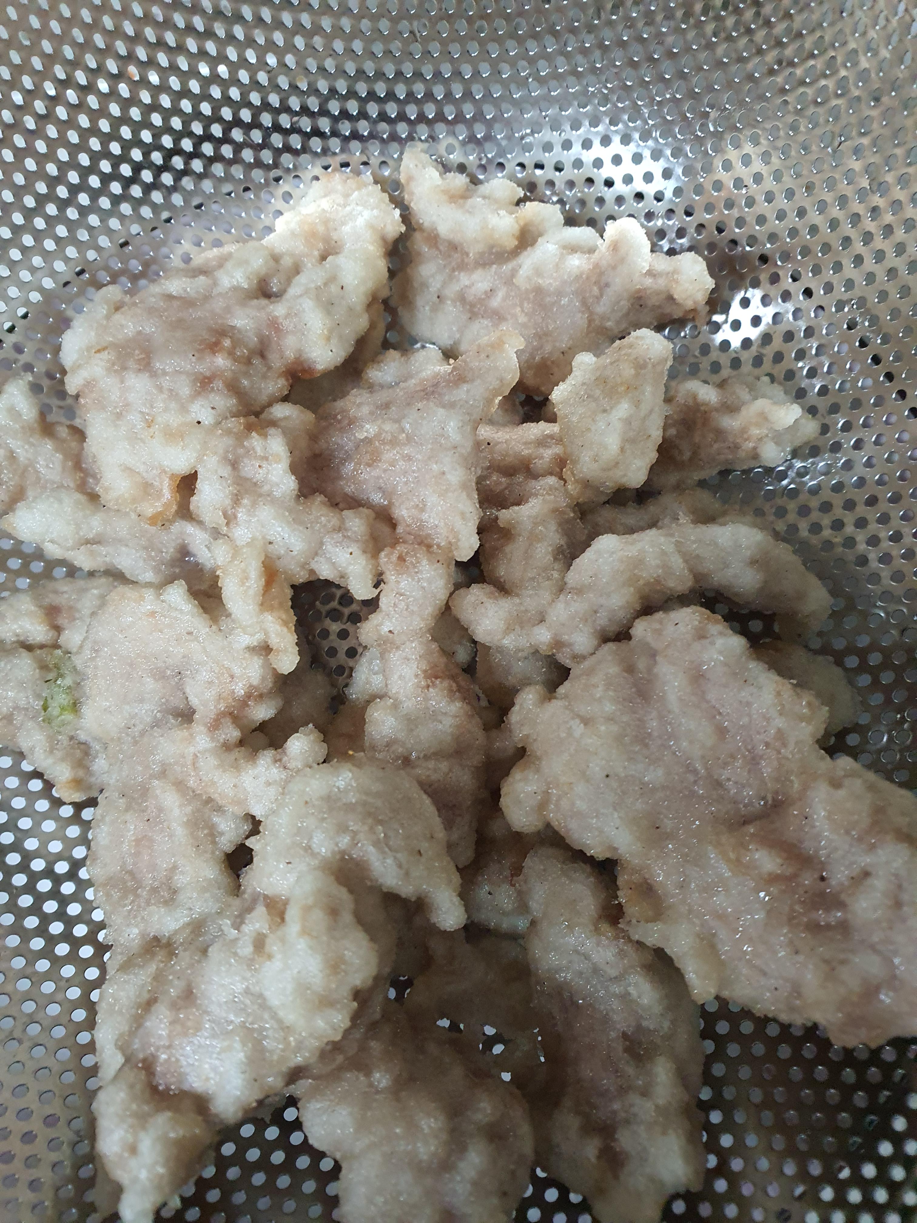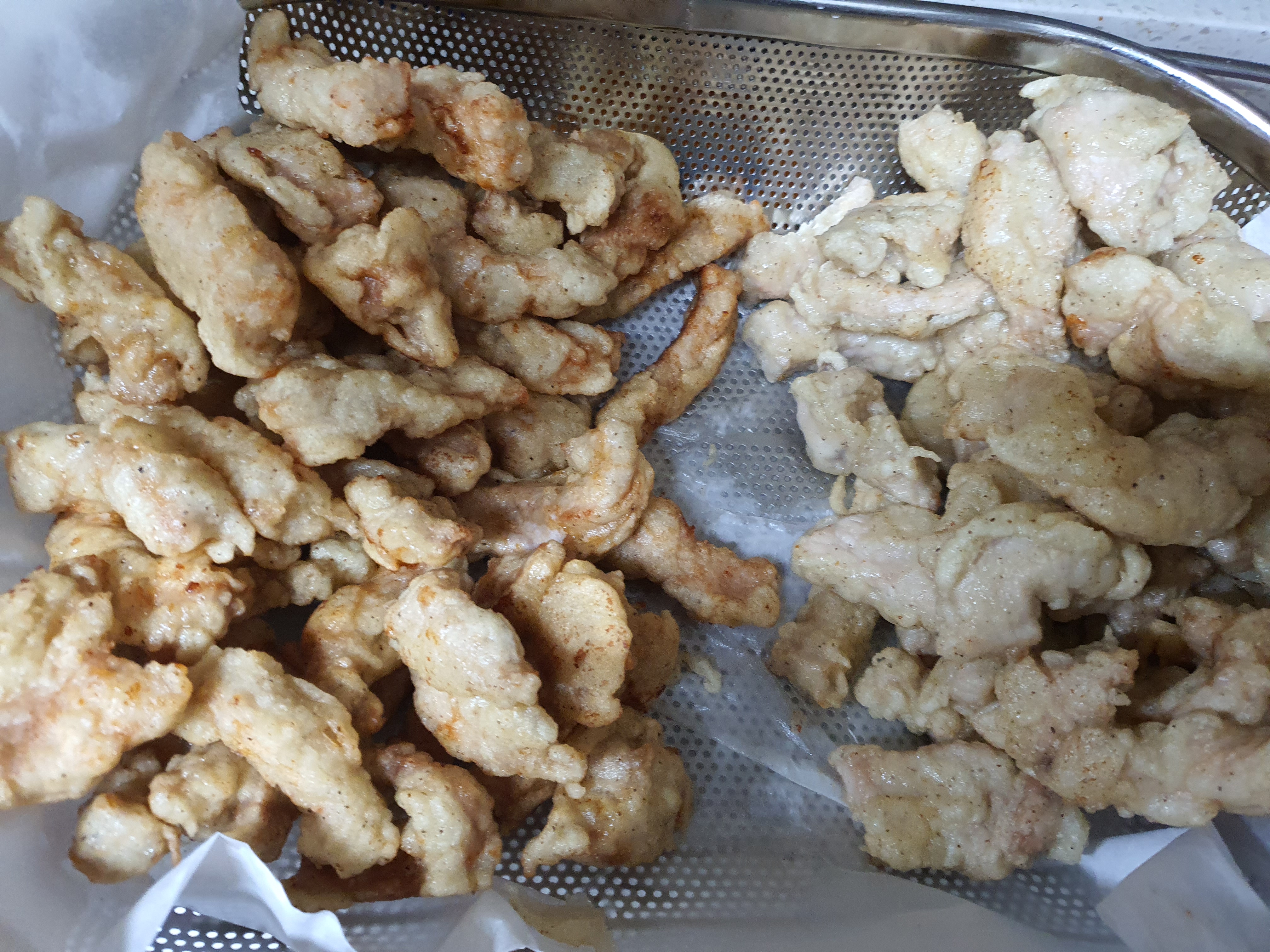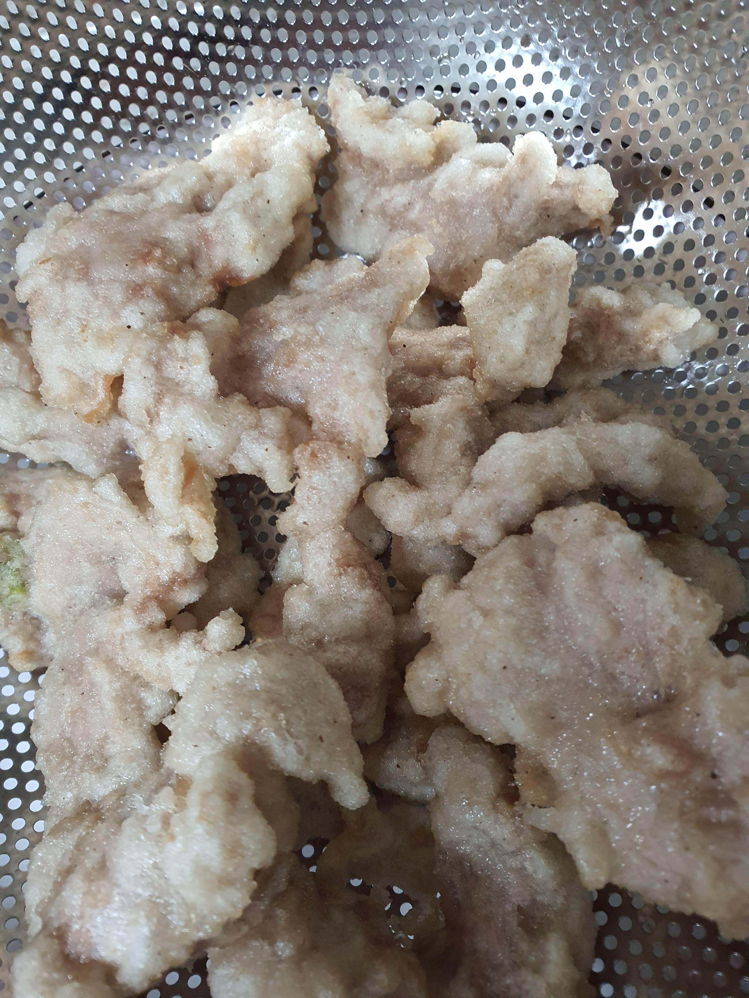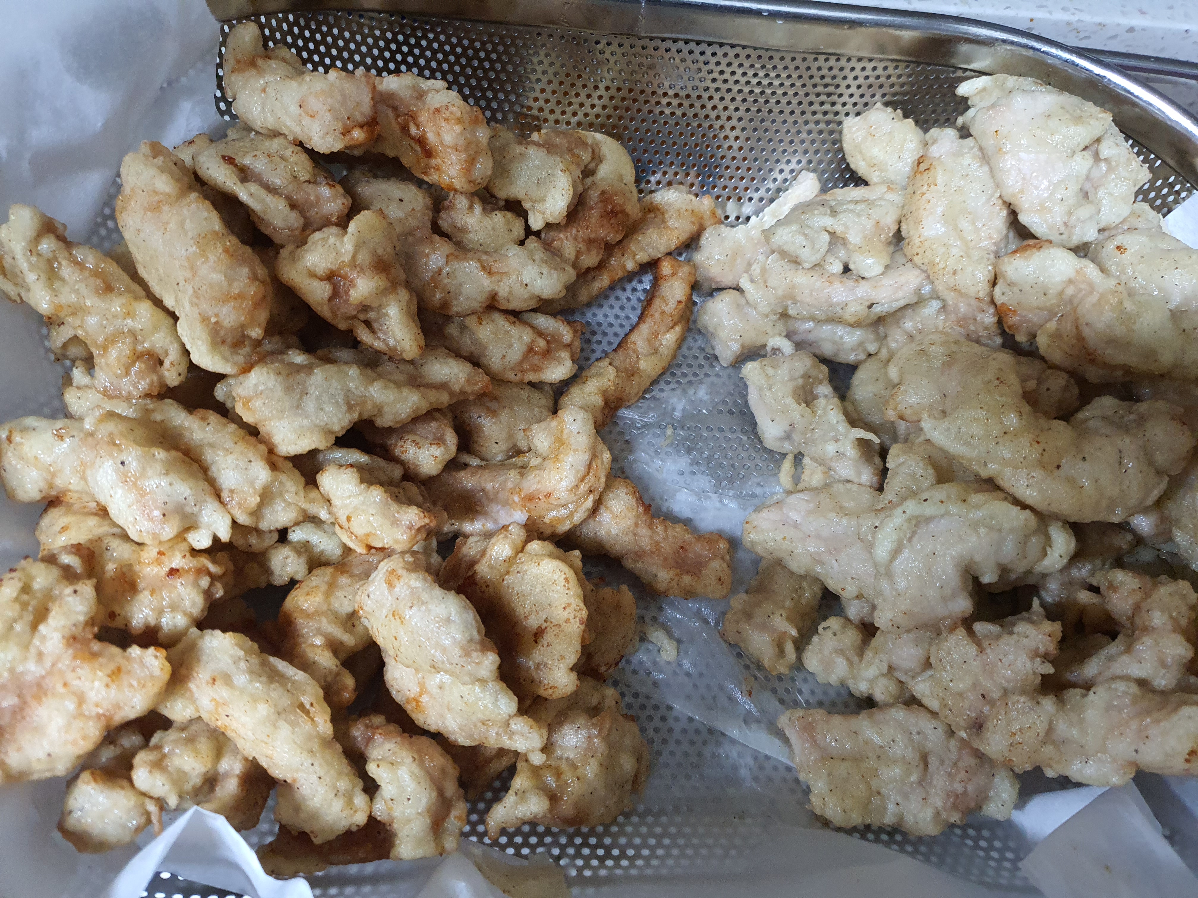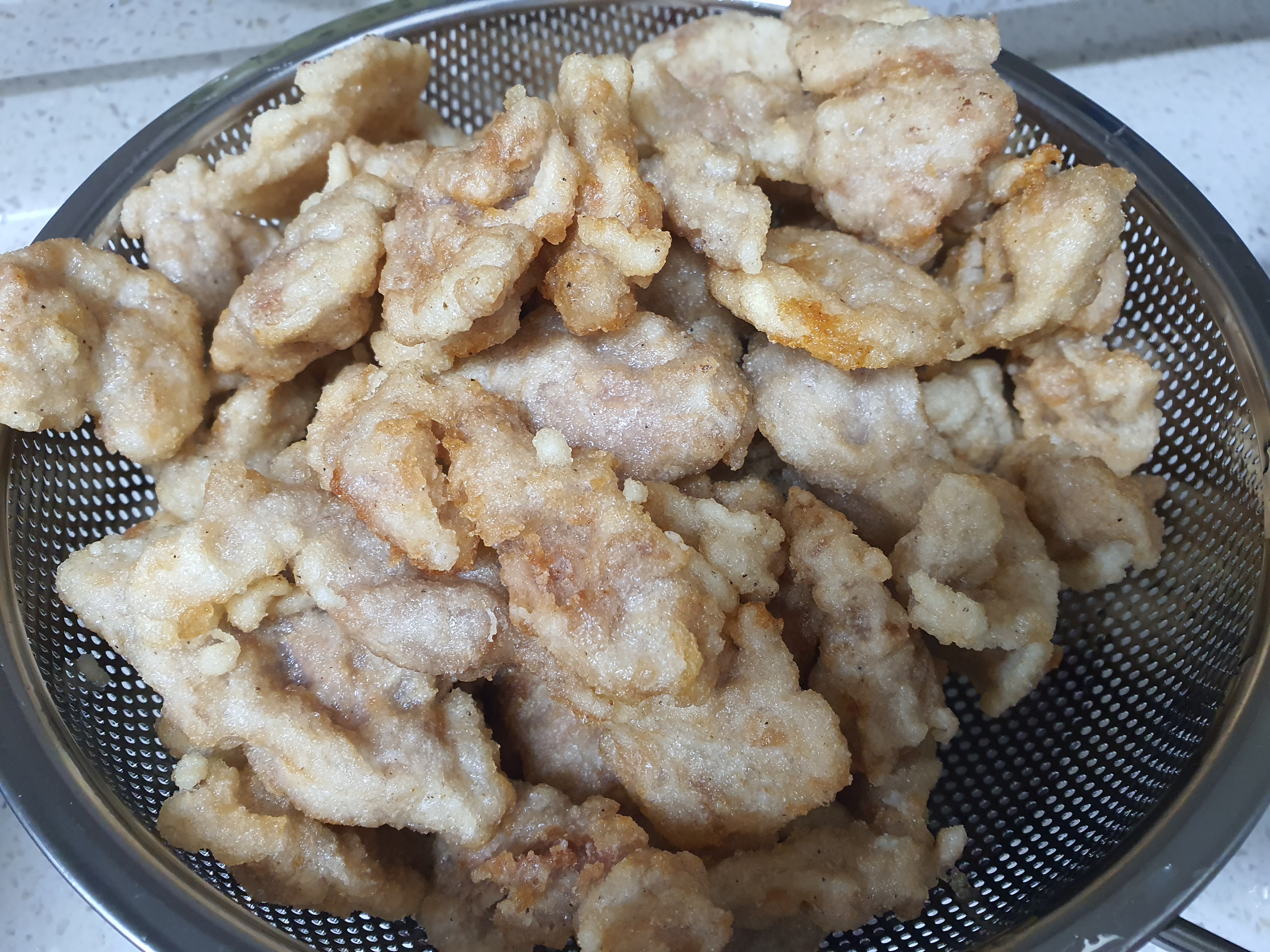 첫번째는 고기가 어느정도만 익으면 서로 붙지 않게 관리하고 바로 빼주고 두번째는 바삭하게 완전히 튀겨야 맛있다고 합니다.