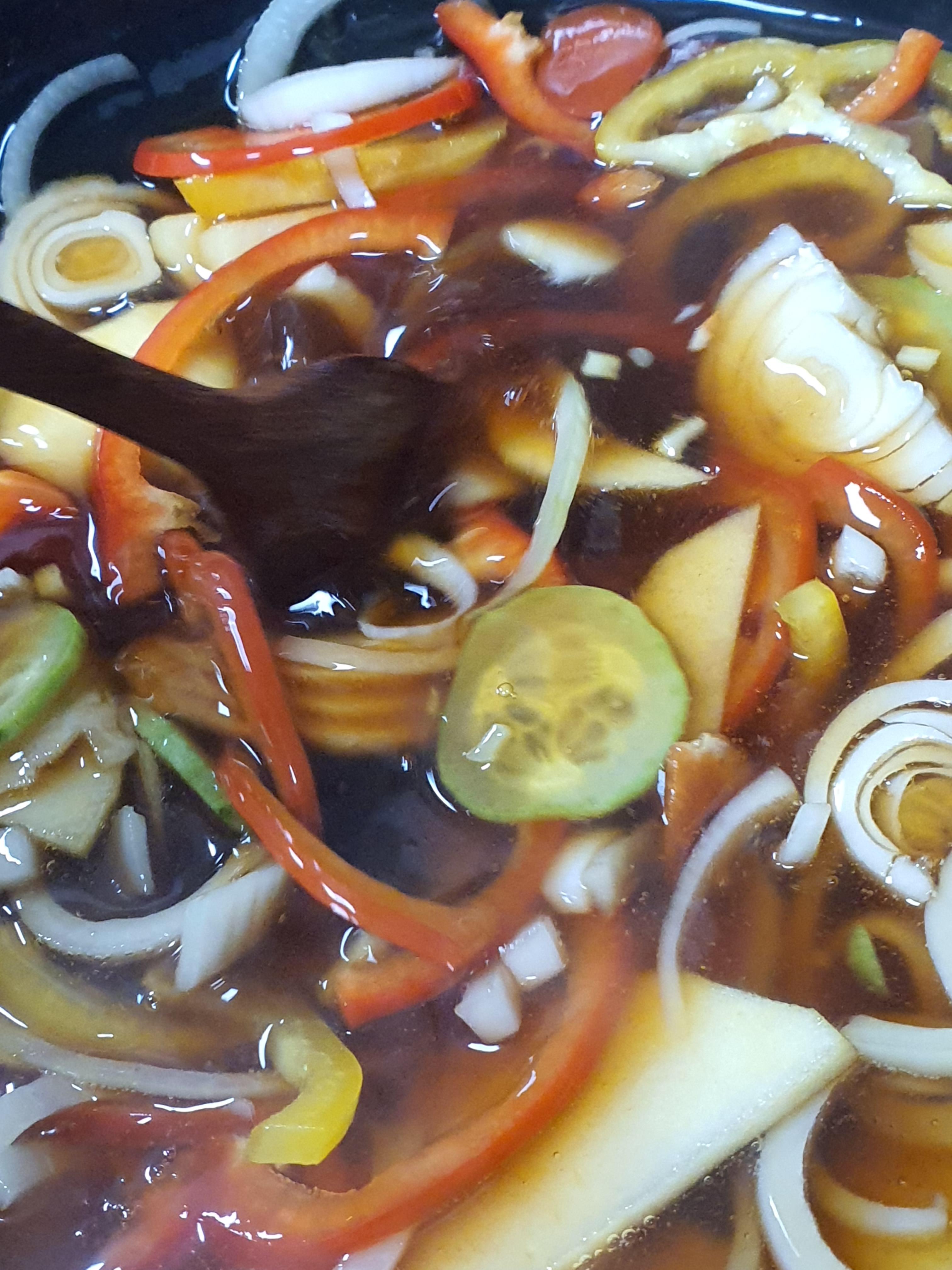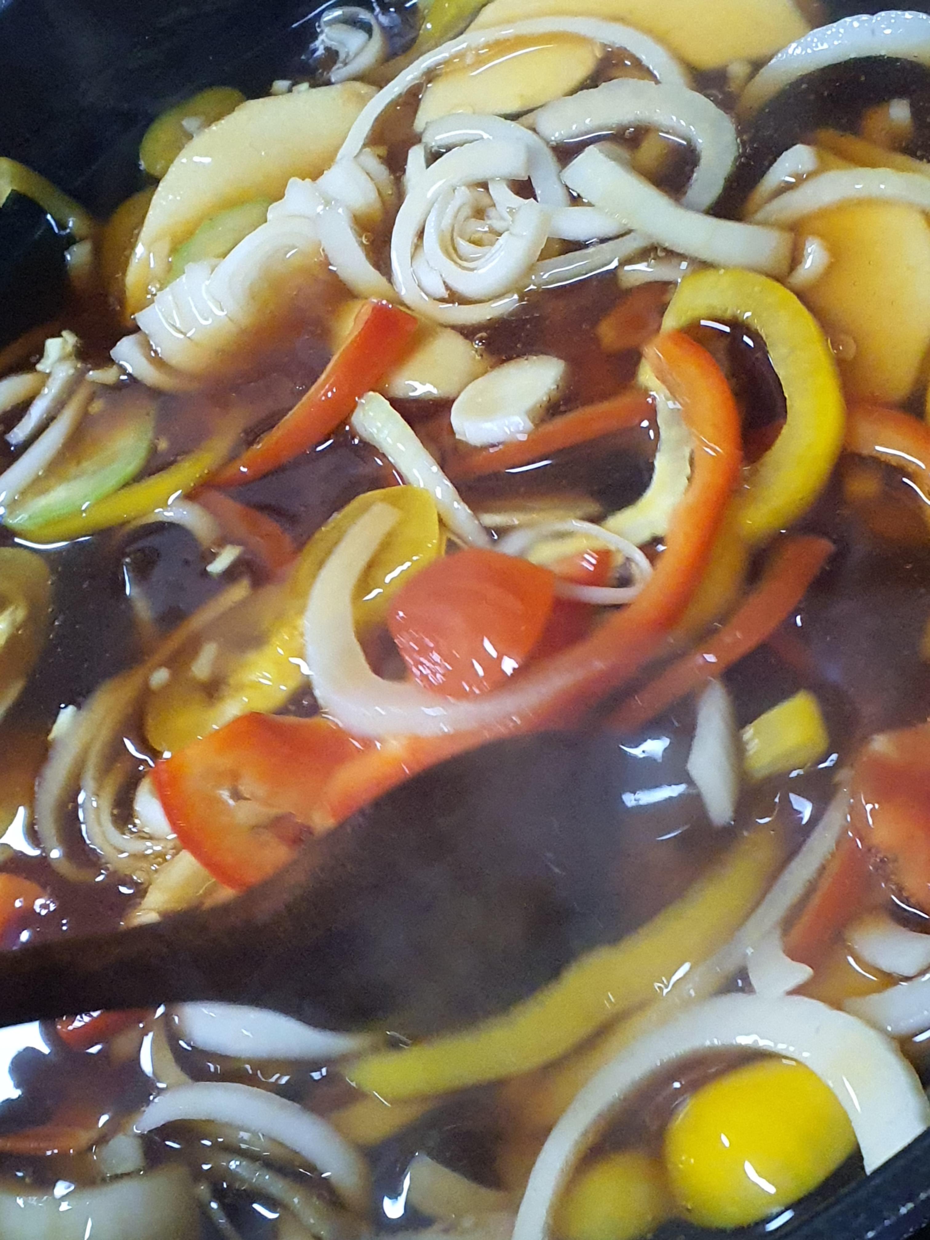 설탕이 다 녹았으면 준비한 야채를 넣어 잘 저어줍니다.