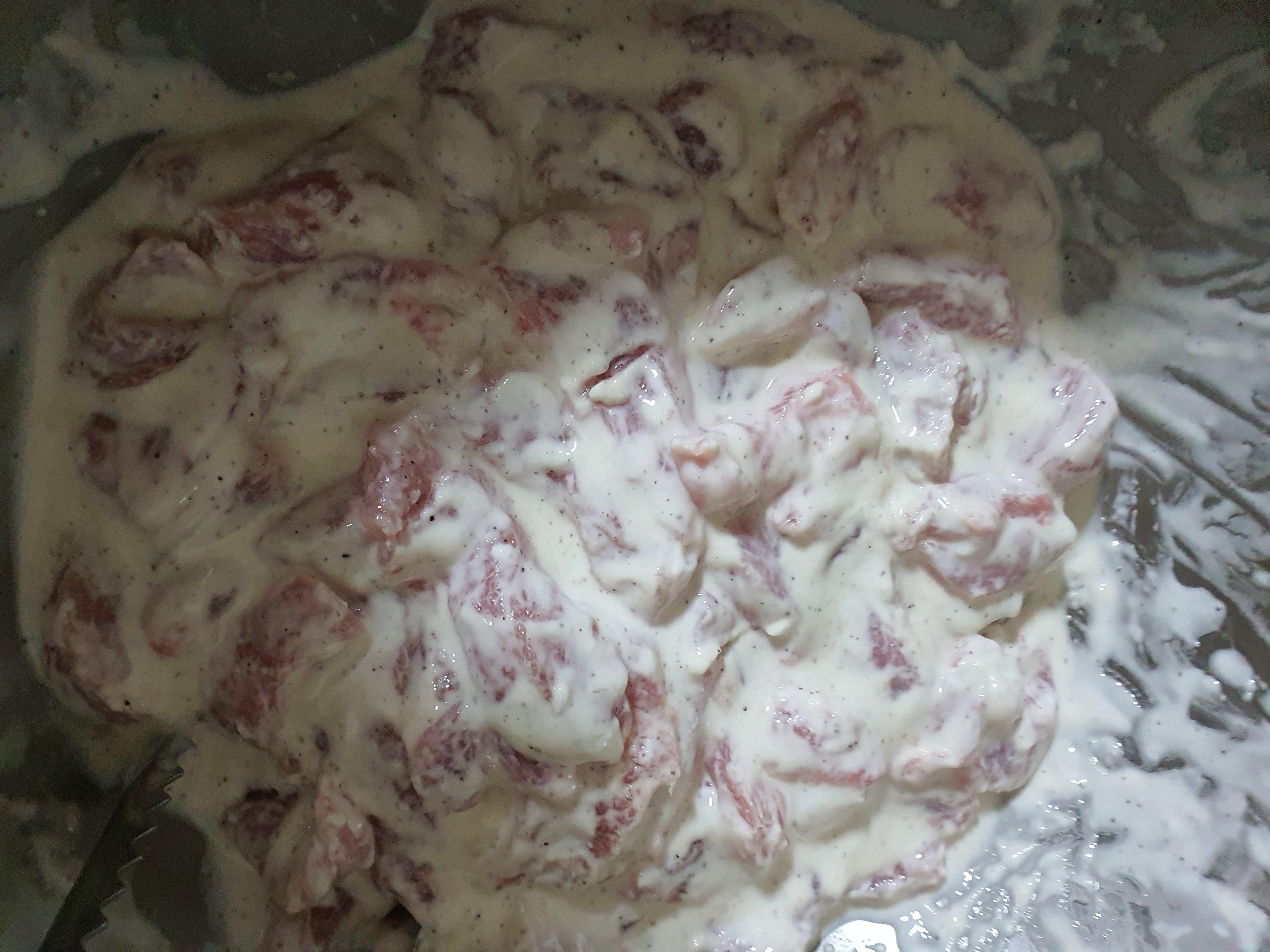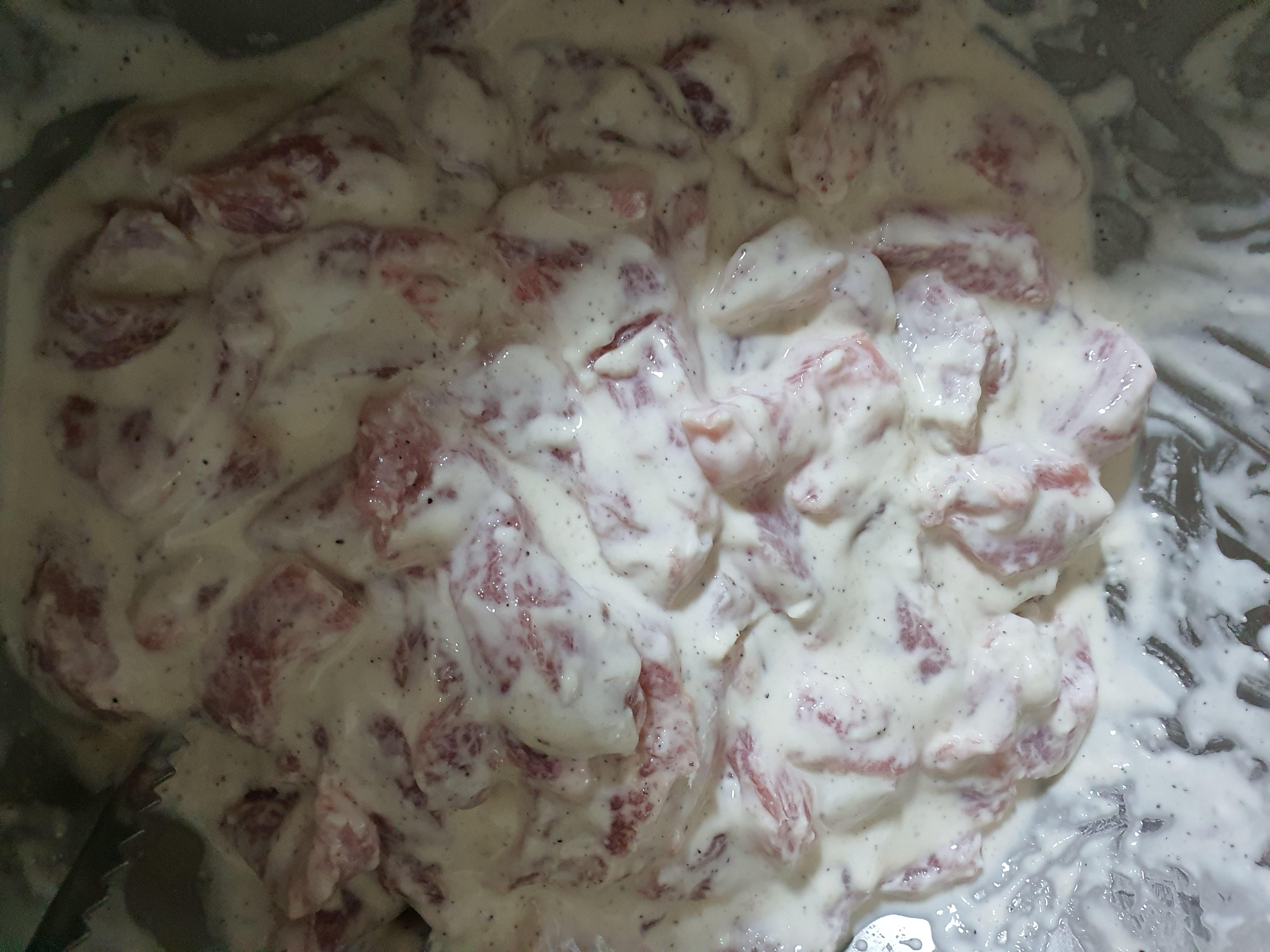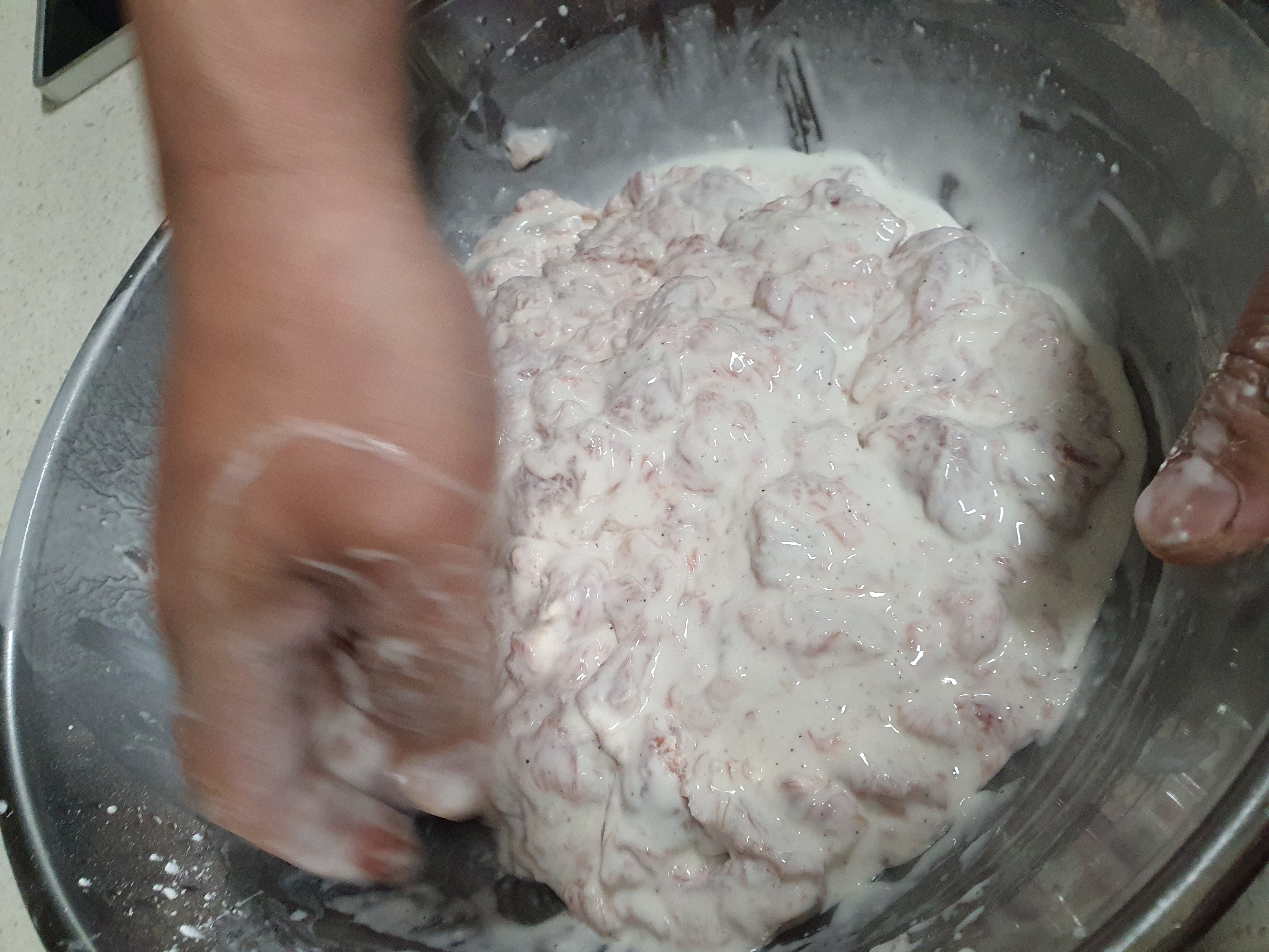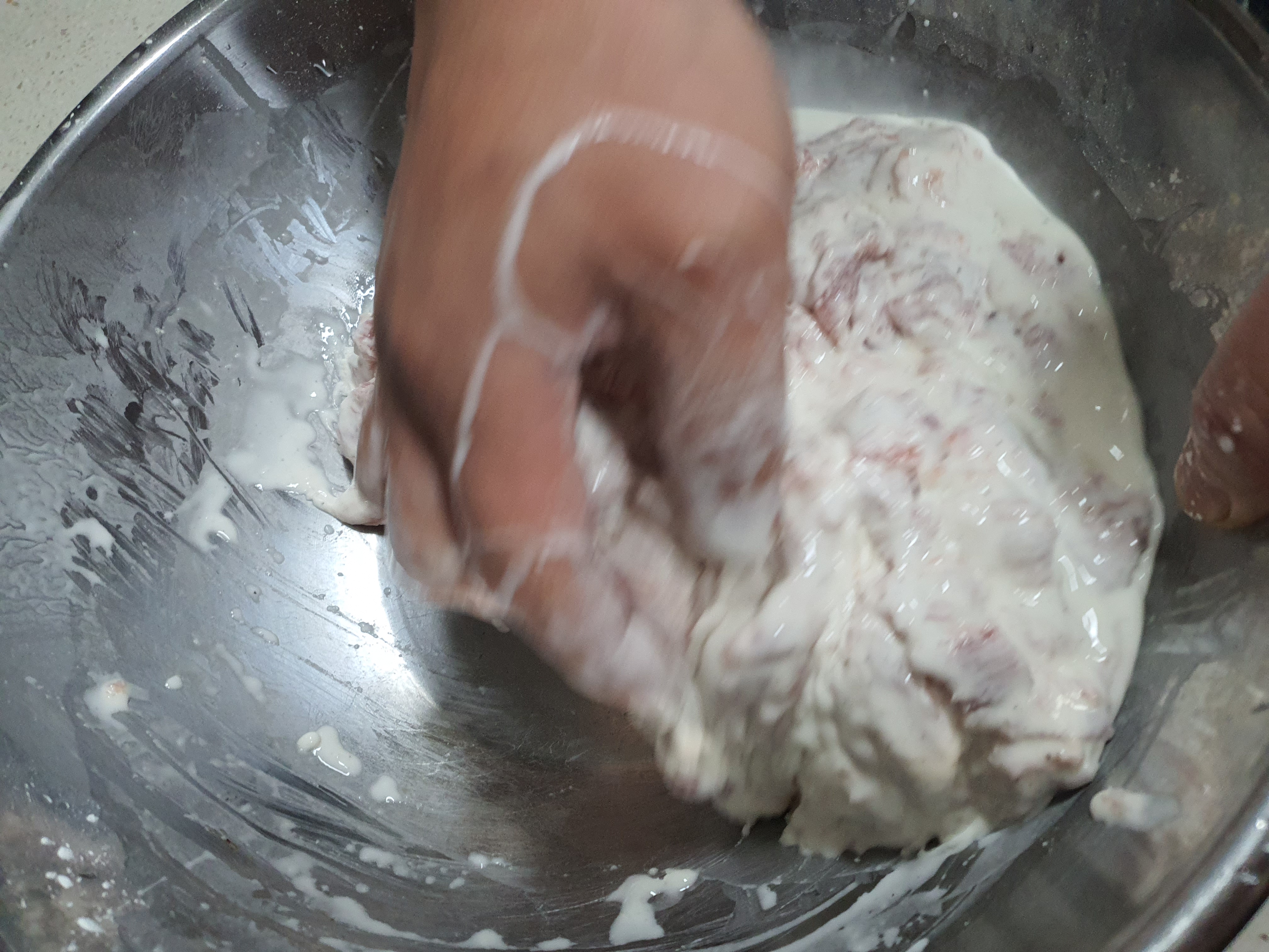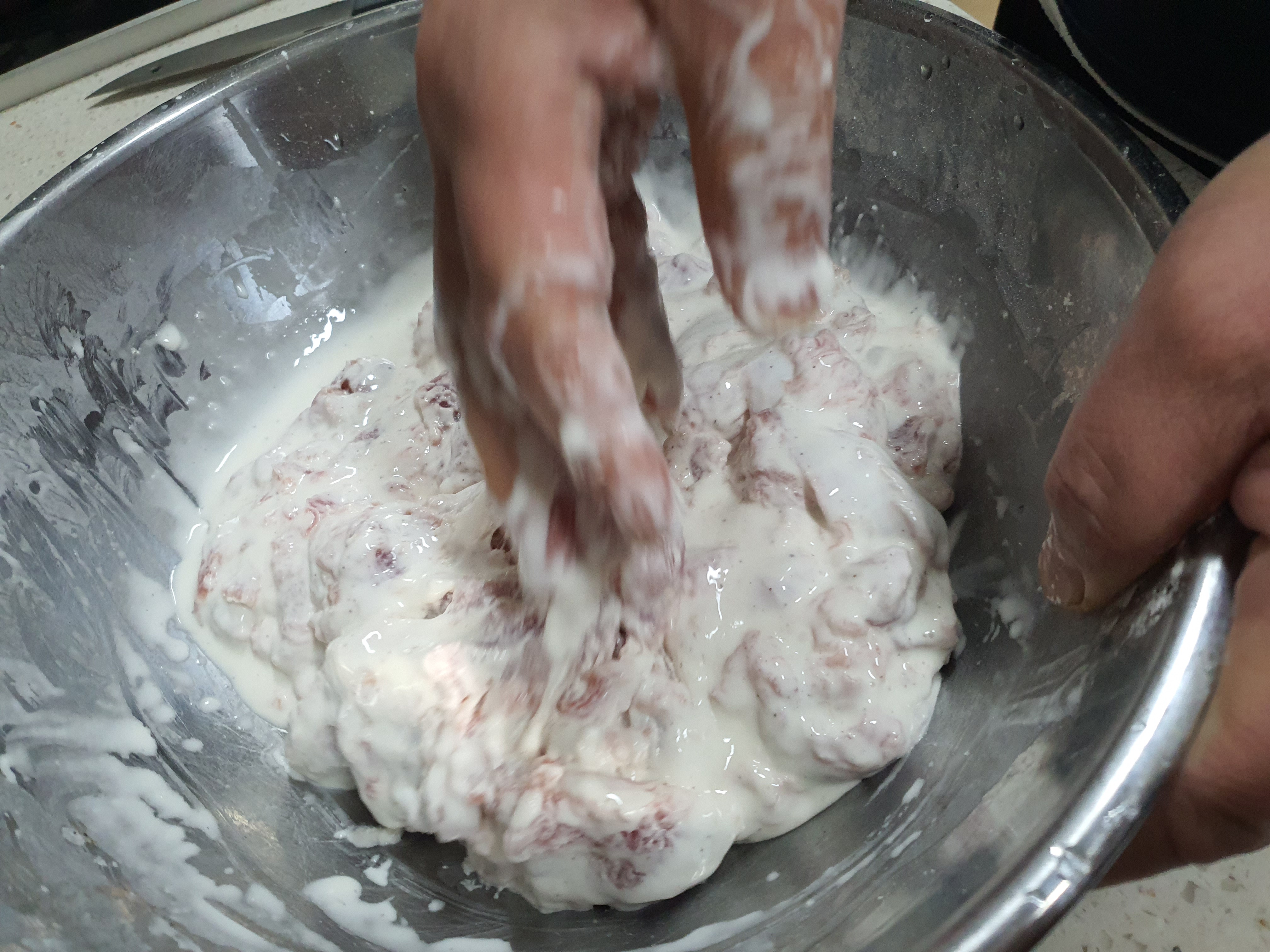 그래서 물양은 별로 중요하지 않으며 양도 조물조물 고기와 섞어줄 때 조절해주면 되고 남은 물은 소스만들 때 사용하면 된다고 합니다.