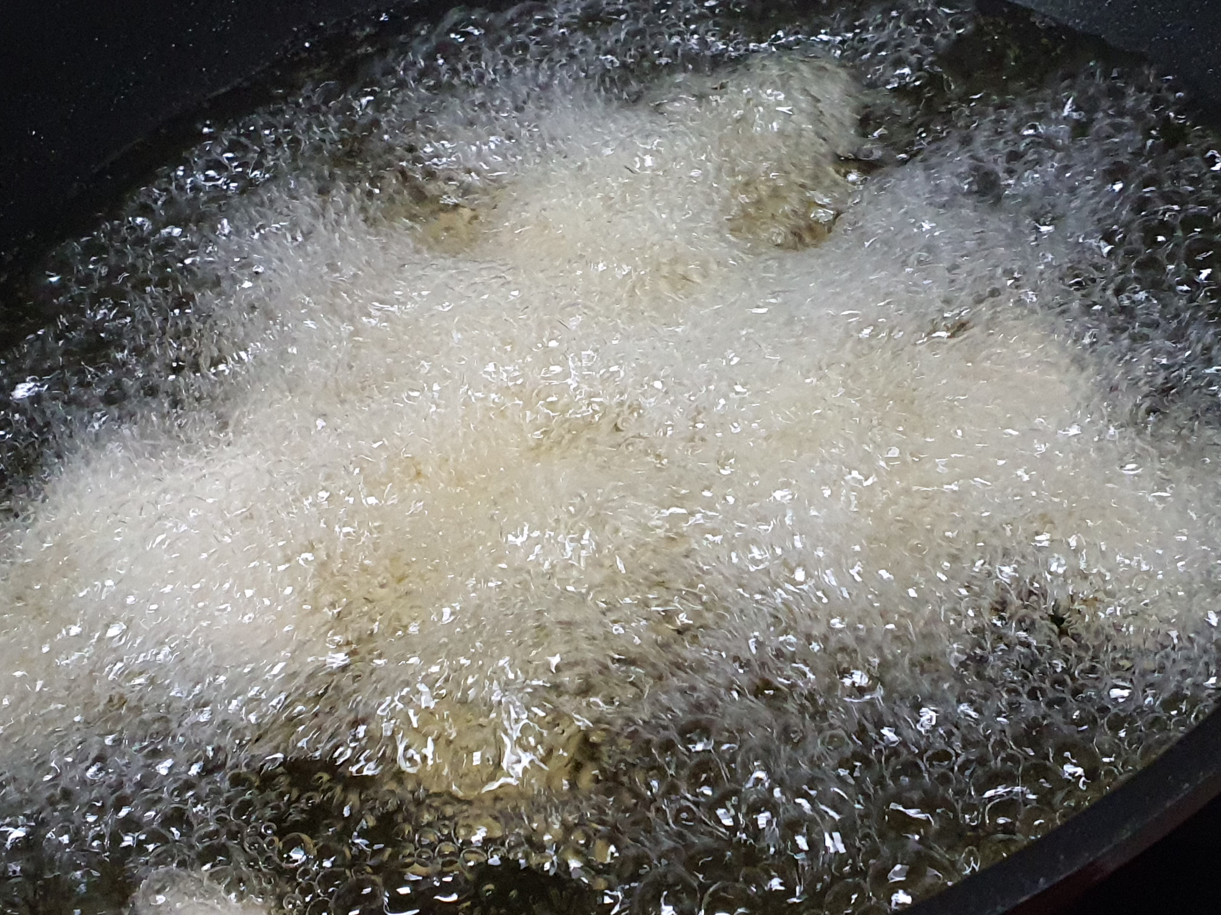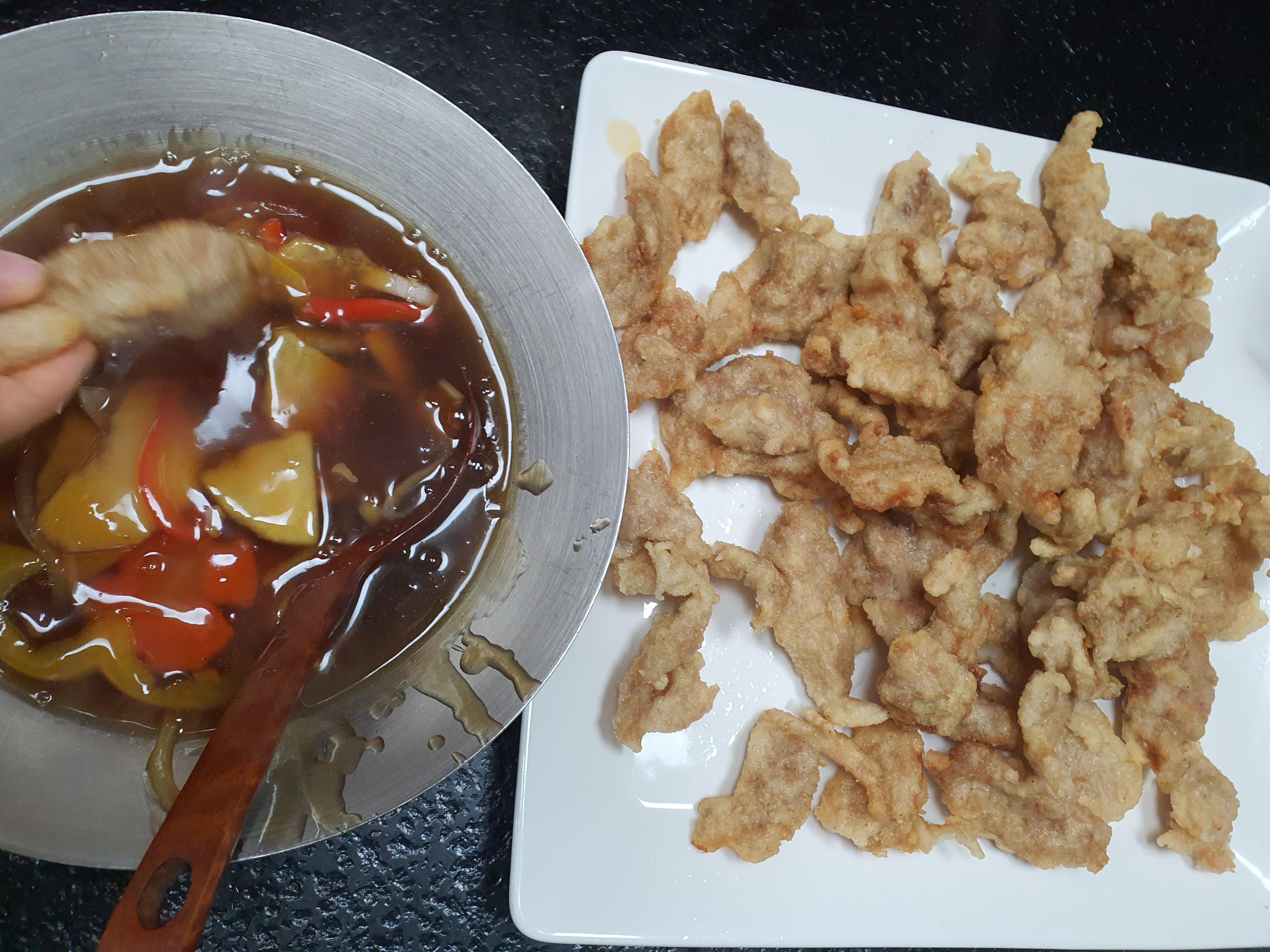소스가 너무 뜨거운 것보다는 어느 정도 식으니 더 맛있으니 소스가 식을 동안 고기만 튀기면 될 것 같습니다.