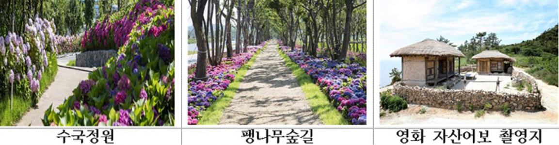 도초도는 수목이 무성해 이름이 붙여진 만큼 해마다 6월 수국정원에서 100여 종의 수국을 볼 수 있으며, 마을 전체에 팽나무숲길도 펼쳐집니다.