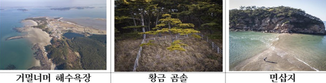 먼저 삽시도의 황금 곰솔은 엽록소 등에 의해 황금빛을 띠는 소나무로 보령시 보호수이고, 면삽지는 조수간만에 의해 삽시도와 연결되는 섬입니다. 물망터는 썰물 때만 드러나는 바위입니다.