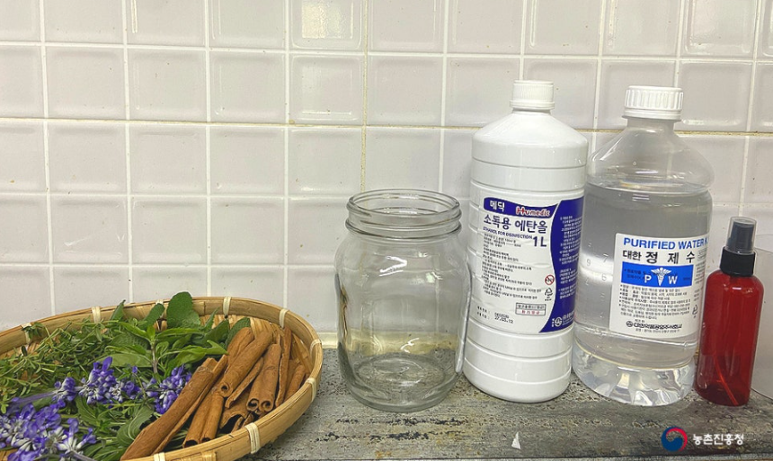 유리병 700ml, 허브 50g, 소독용 에탄올 600ml, 정제수 1.4L, 스프레이 용기 100ml 1개, 계량컵 1개